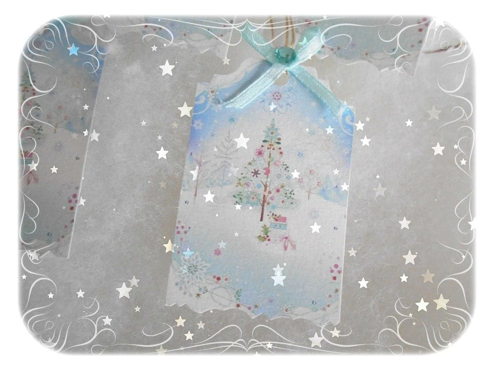 12 Étiquettes de Noël , imprimées et découpées par mes soins sur papier Canson blanc , 220 grs.