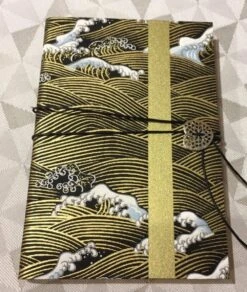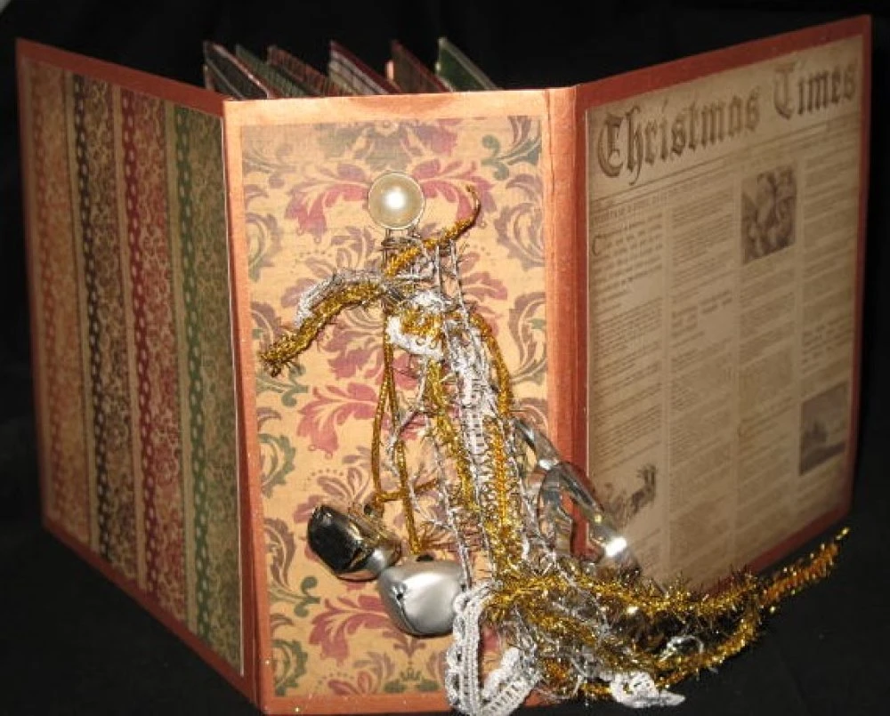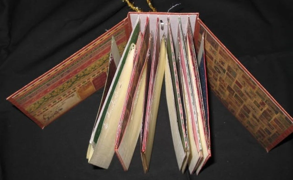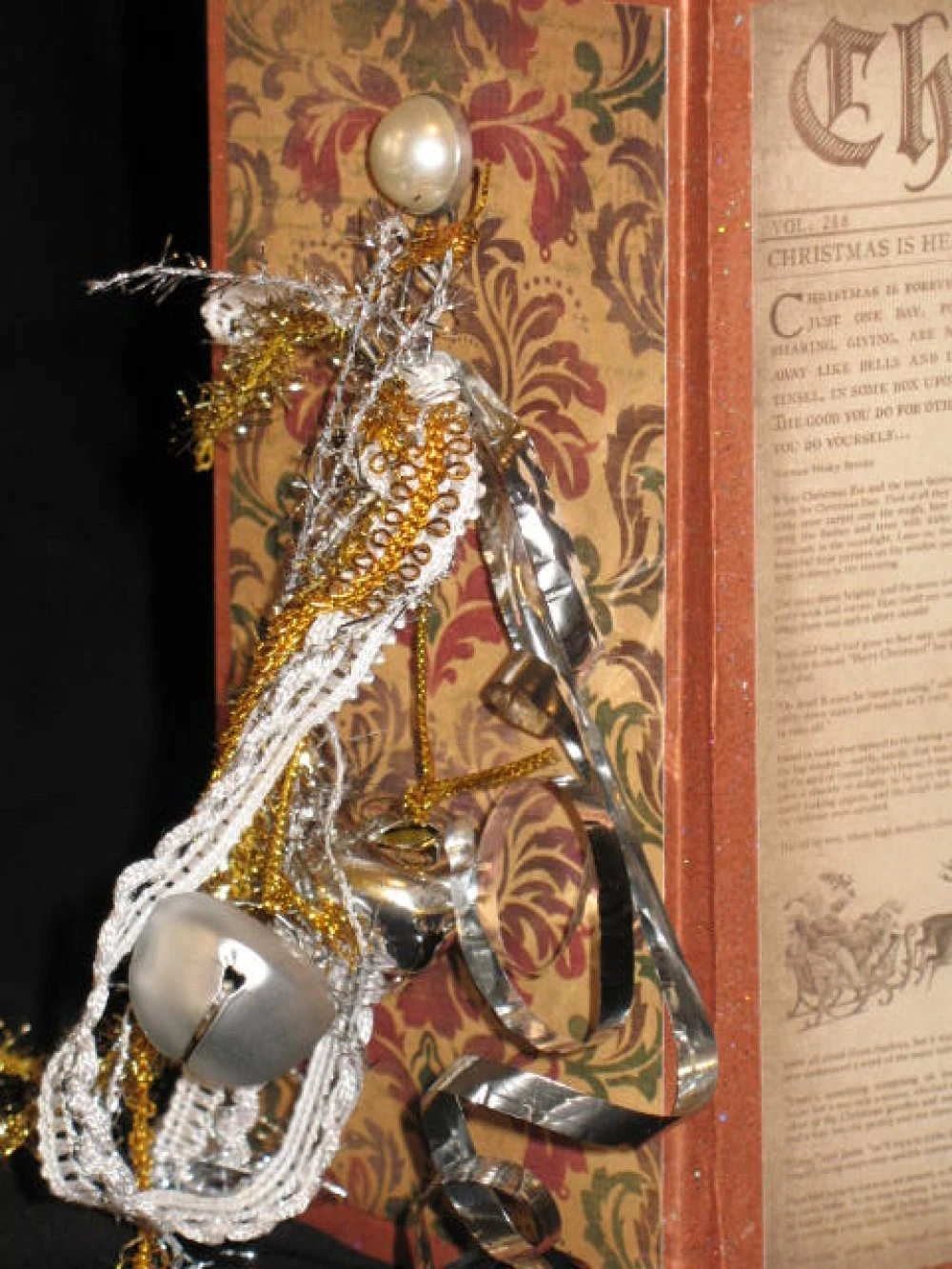 Petit bijou de livre fait avec des rubans dorés, argentés, des grelots pour se rappeler Noël.