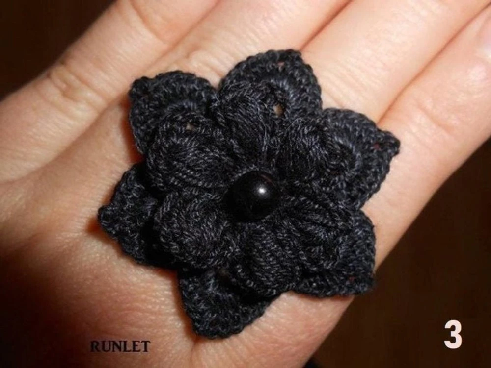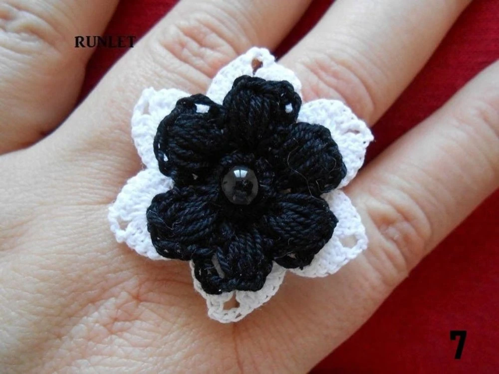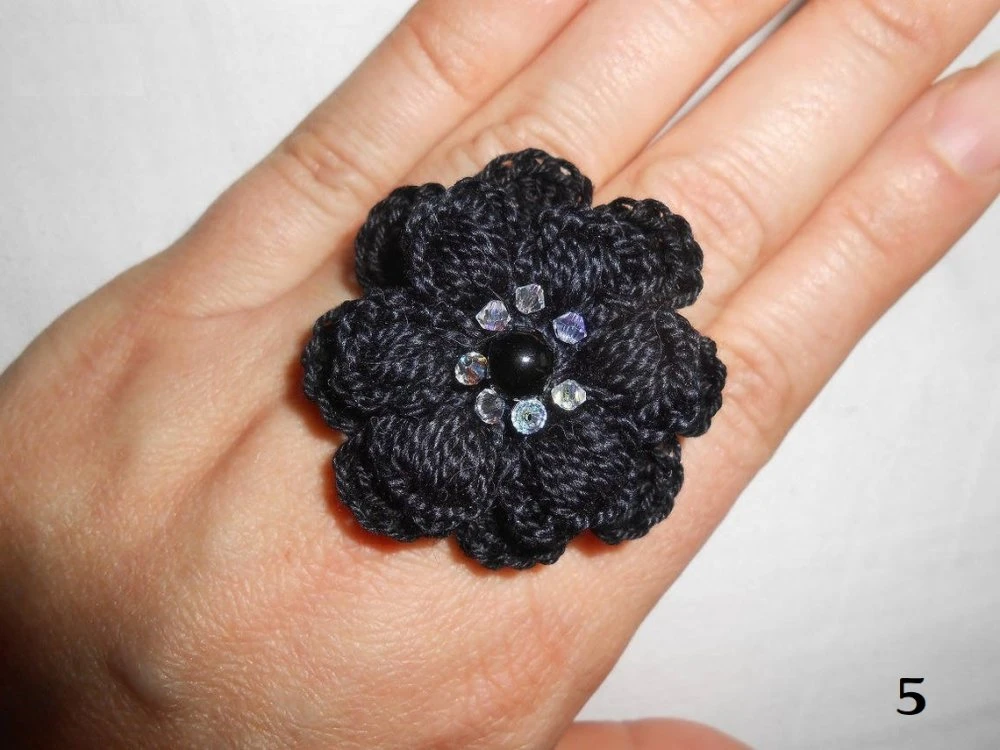 Bague réglable fleur au crochet fait en coton belle qualite tres fin dmc au crochet n 1.5 avec perle de verre.