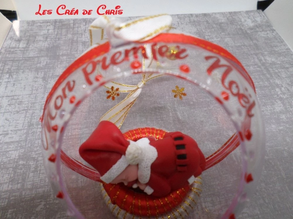 bébé fimo thème de noël dans sa boule à suspendre au sapin ou à poser après les fêtes pour souvenir.