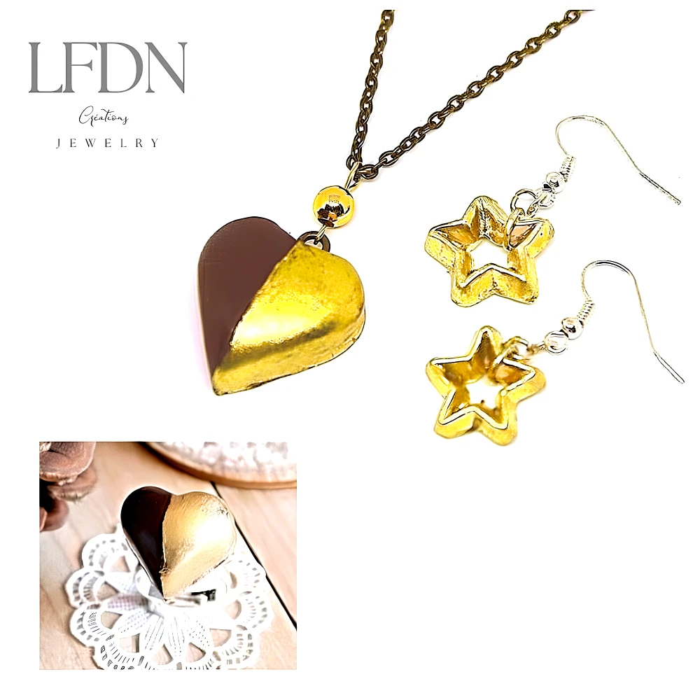 lesfimodelicesdenathy, bijoux fimo noël, bague coeur, collier coeur fimo, boucles d’oreille étoiles, bijoux gourmands