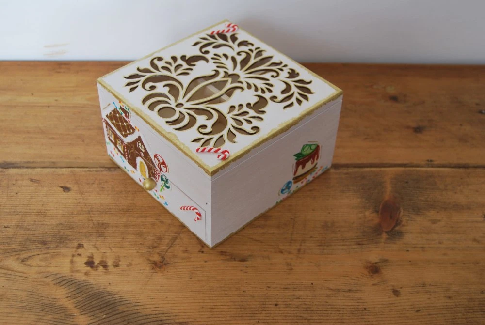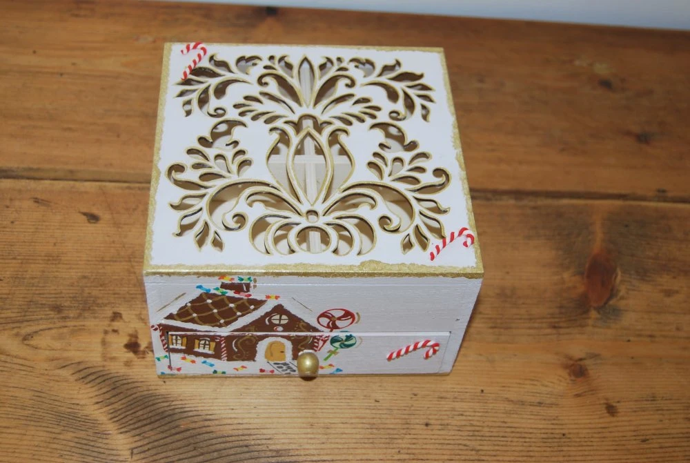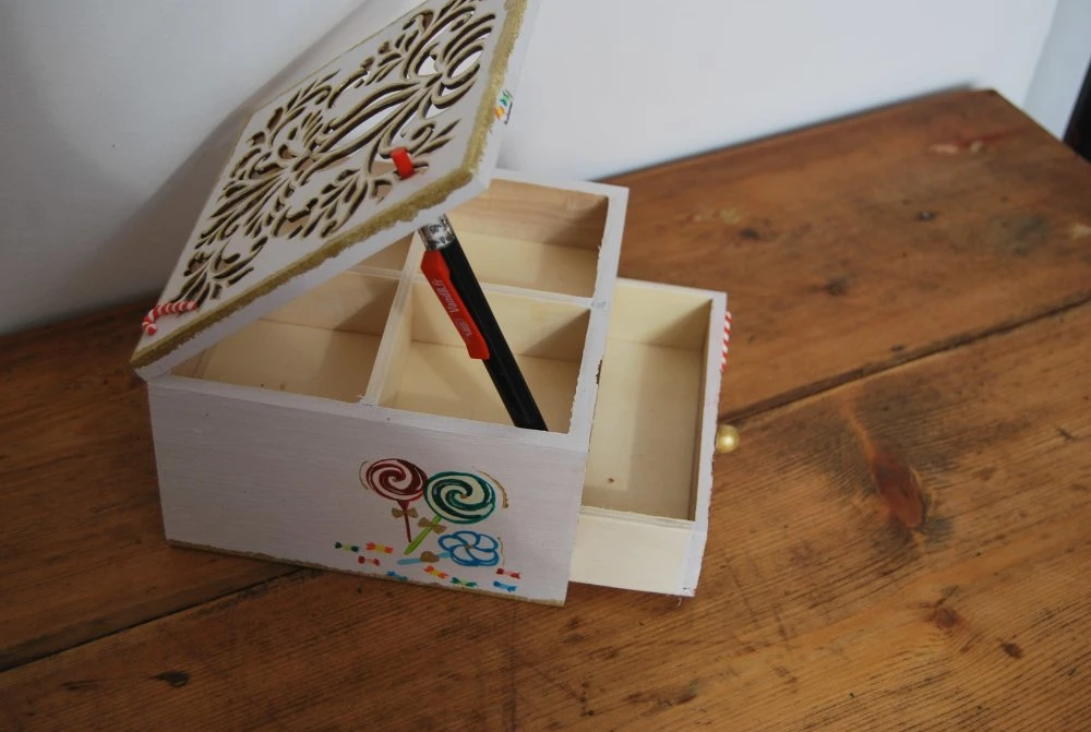 Jolie petite boite a bijoux en bois avec ouverture sur le dessus diviser en 4 compartiment et un tiroirs sur le devent.