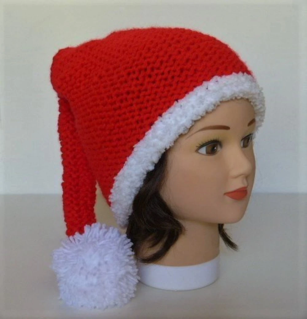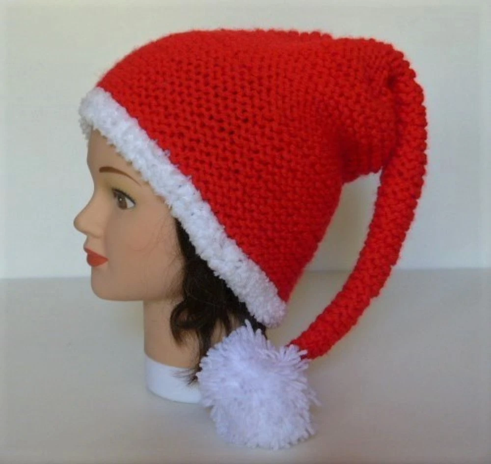 Bonnet lutin de père Noël tricoté main unisexe .
