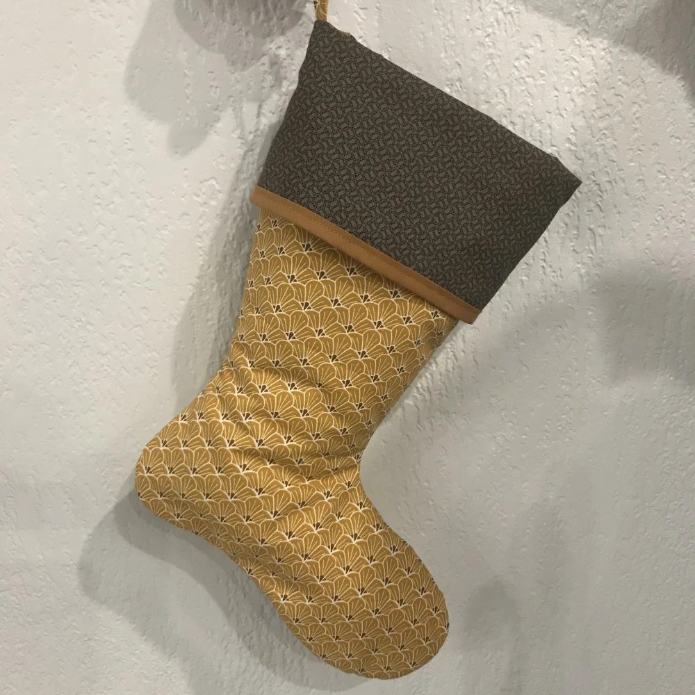 Botte de Noël à garnir de petits cadeaux ou de décorations. Elle peut être suspendue par une ansette