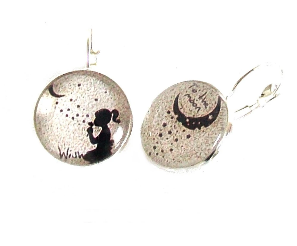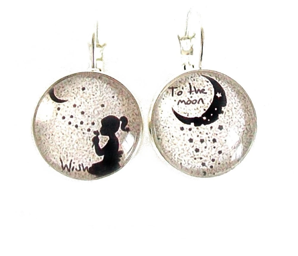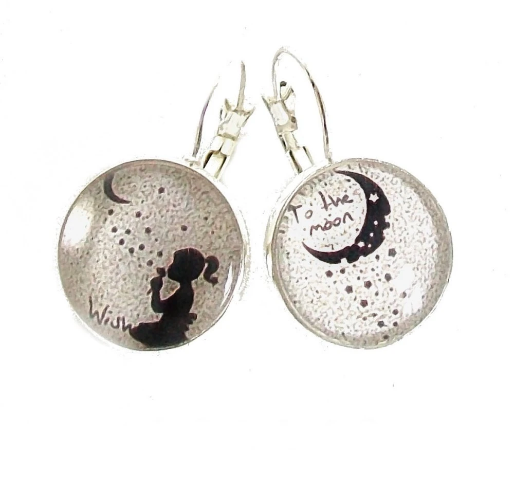 Voici une paire de boucles d’oreilles cabochon en acier inoxydable. L’image représente un motif féerique avec une fillette ainsi que la lune et des étoiles noires sur fond gris. Un dôme en verre ou cabochon effet loupe recouvre et protège l’image.