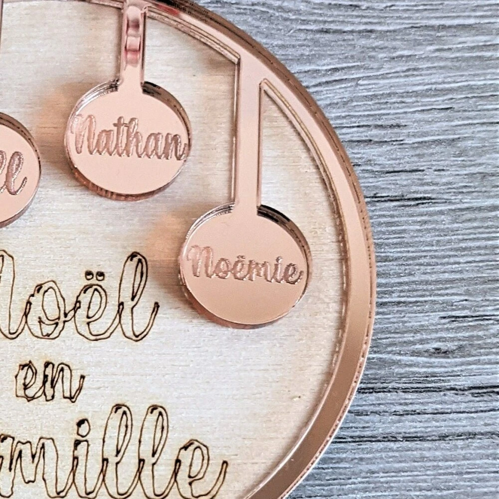 👉 La boule de noël est composé d’un font en contre plaqué de peuplier et d’une partie en acrylique miroir or-rose ou Argent ou acrylique transparent.