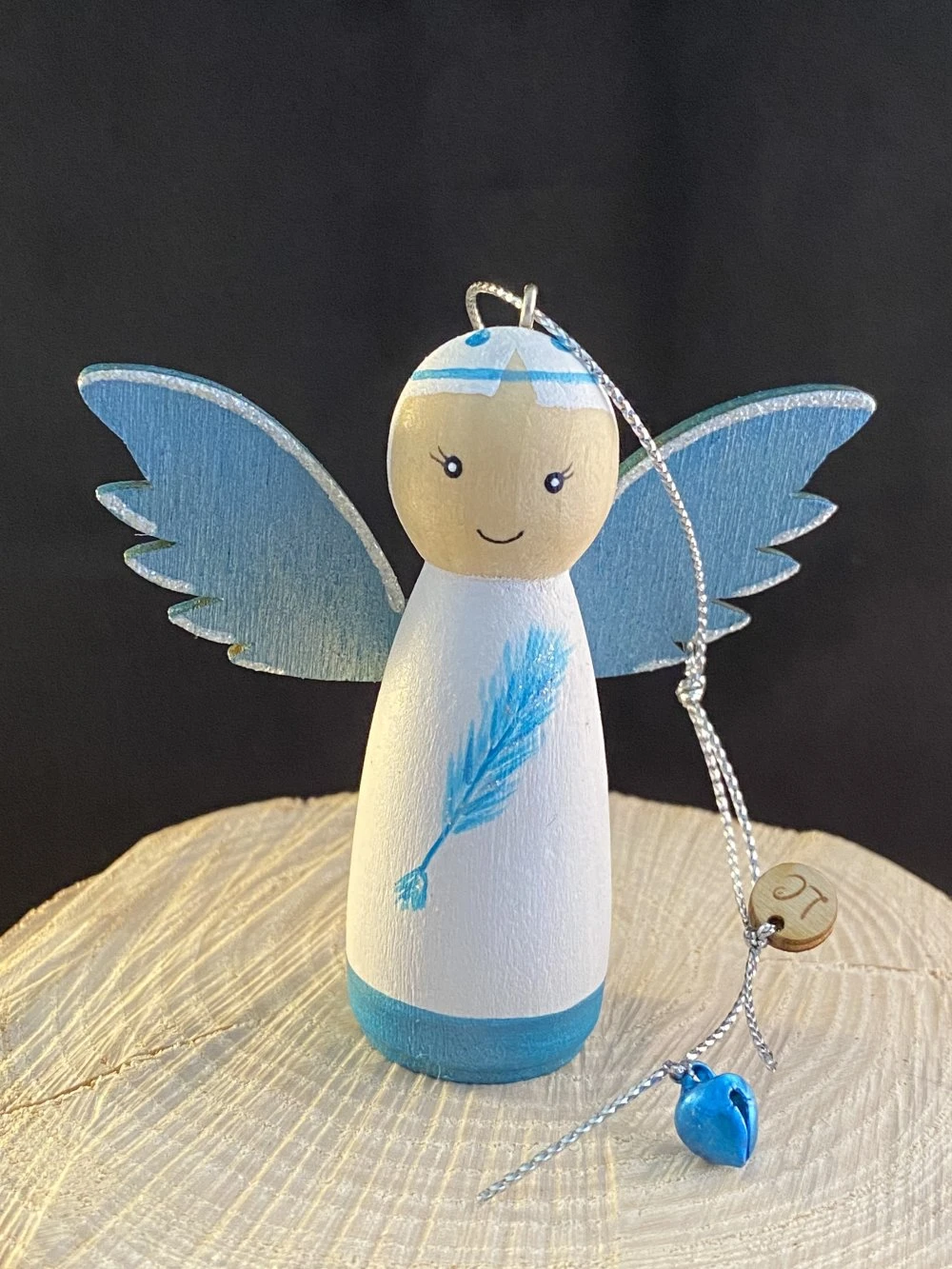 Après avoir peint à la main quelques crèches en bois, mes filles m’ont demandé de réaliser également des boules en bois pour notre sapin … D’où l’idée de développer une gamme de plusieurs sortes de déco de Noël à suspendre dans le sapin ! Ici un joli petit ange turquoise et blanc en bois de 6,5 cm suspendu avec un joli cordon argenté et fini par une clochette ! Il est bien entendu peint à la main dans mon petit atelier bourguignon et verni satiné . Si vous désiriez une couleur ou une taille bien précise plus grande ou plus petite n’hésitez pas à fouiller dans ma boutique ou à me demander une création sur mesure.