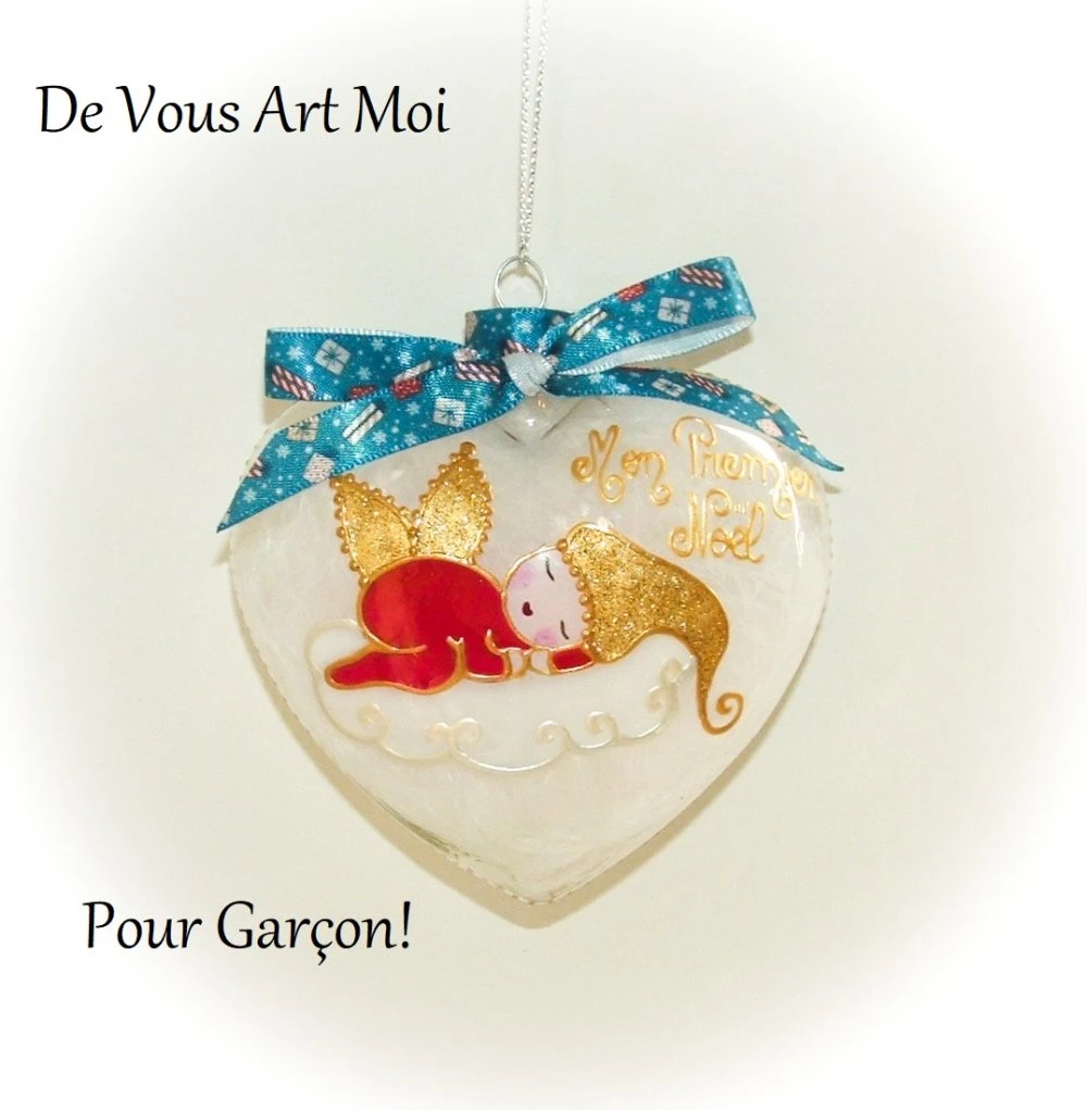 Boule premier Noël personnalisée garçon,bébé de noël cœur verre,peinte main,boule prénom petit garçon,boule noël bébé