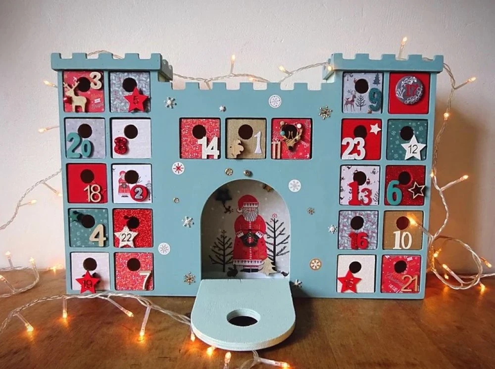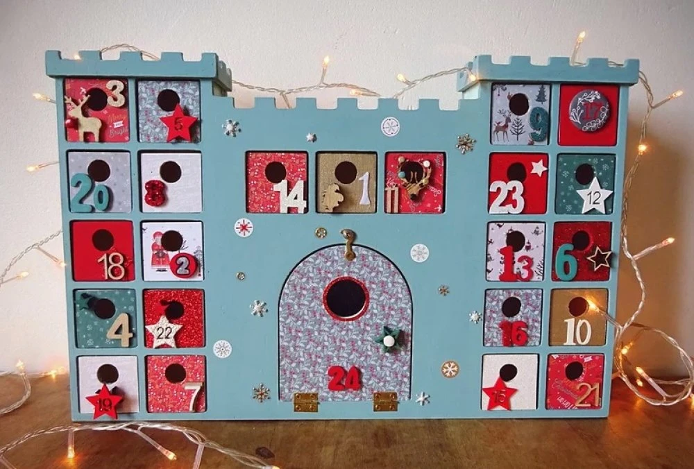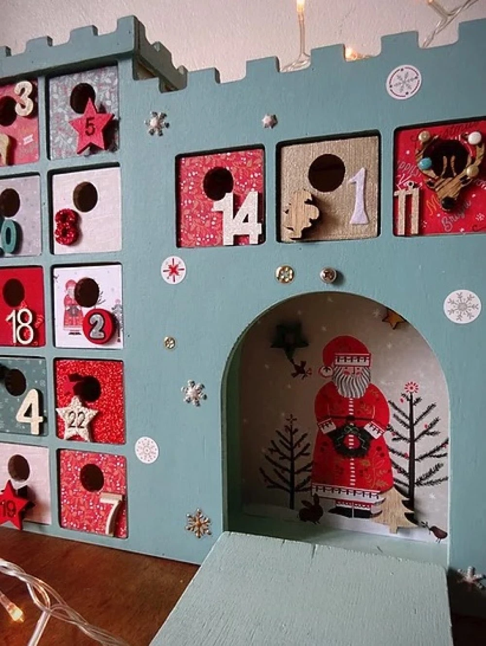 Sur une base en bois, on vous propose dans un joli camaïeu de vert et rouge, ce calendrier château fort, décoré avec amour & minutie 😉