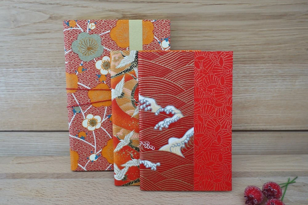 Extérieur en duo de papier japonais, thème marin, reprenant le motif de « la grande vague de Kanagawa » d’Hokusai. En papier principal, un magnifique motif rouge profond, évoquant la grandeur de l’océan, avec ses vagues ourlées d’écume blanche. Pour la bordure, un motif traditionnel de pointillés d’or en éventail sur fond rouge.