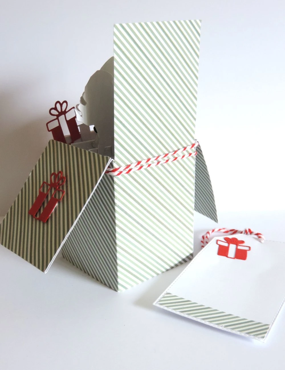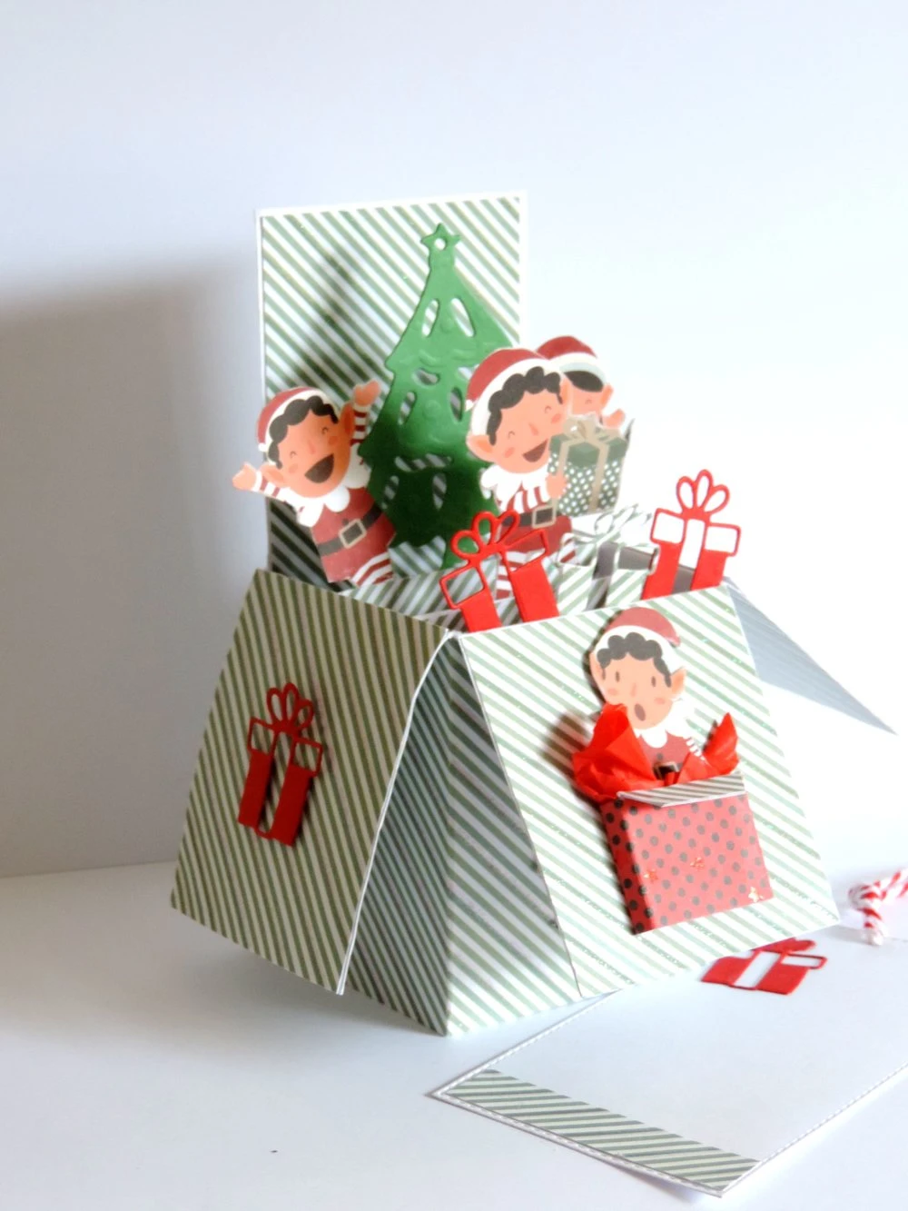 Carte de vœux « Joyeux Noël » de forme boîte pop up, décorée de petits lutins farceurs.
