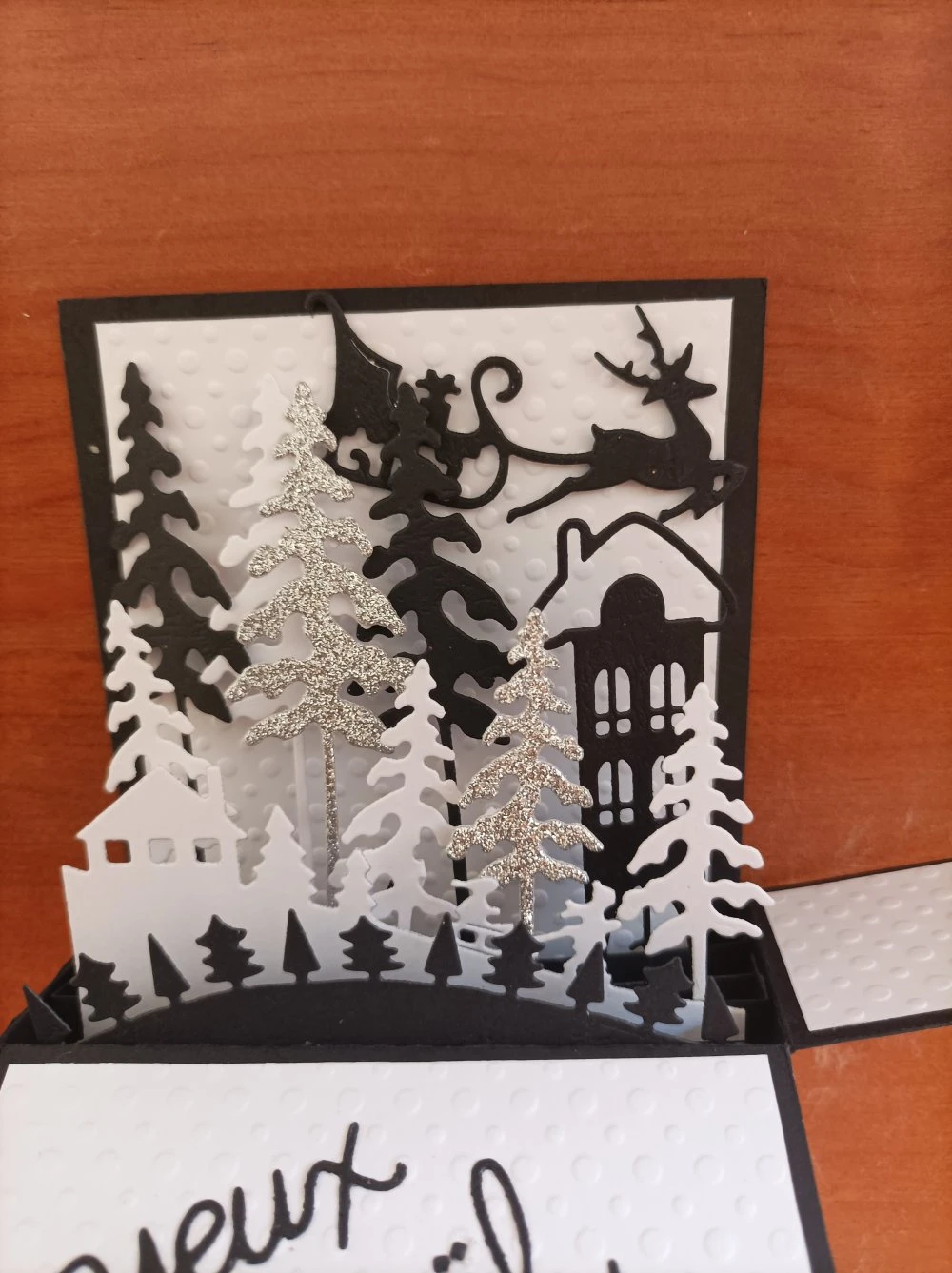 Une carte tout à fait ordinaire fermée, qui, une fois ouverte, est posée comme une boîte et dévoile une multitude de petits éléments en 3 D et en hauteur : un superbe cadeau