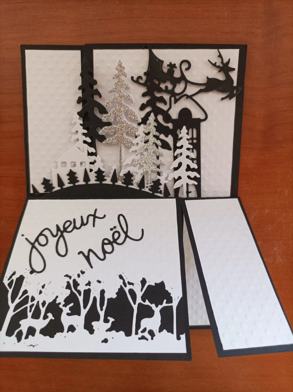 Des découpes dans la boîte : joyeux Noël. Sapins. Maisons. Traîneau. Cerfs…
