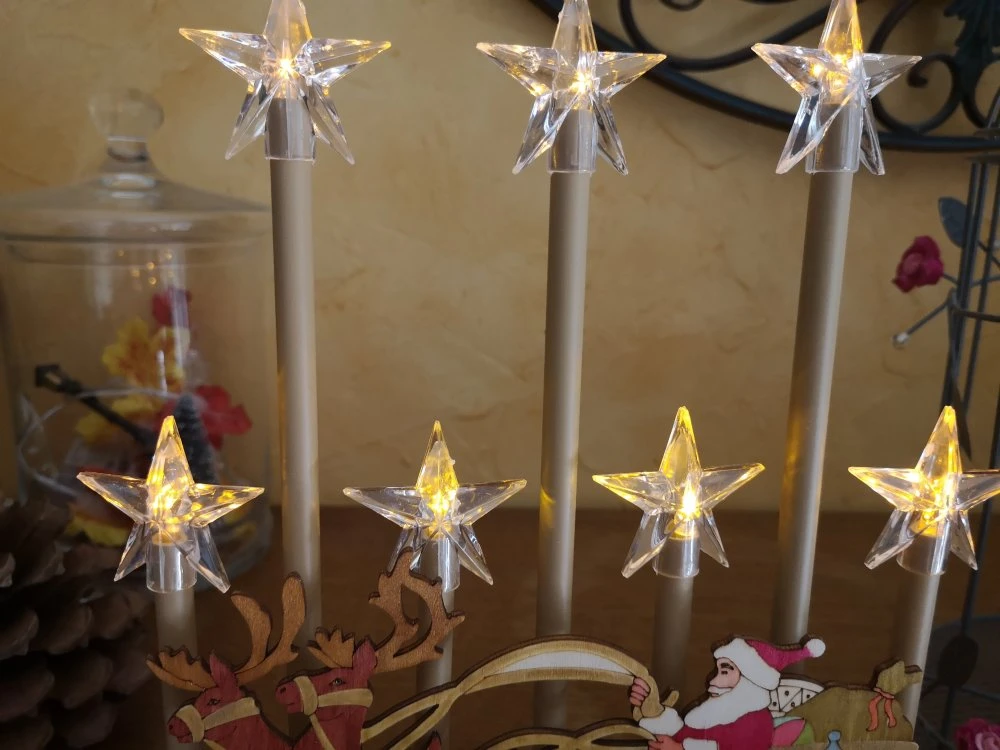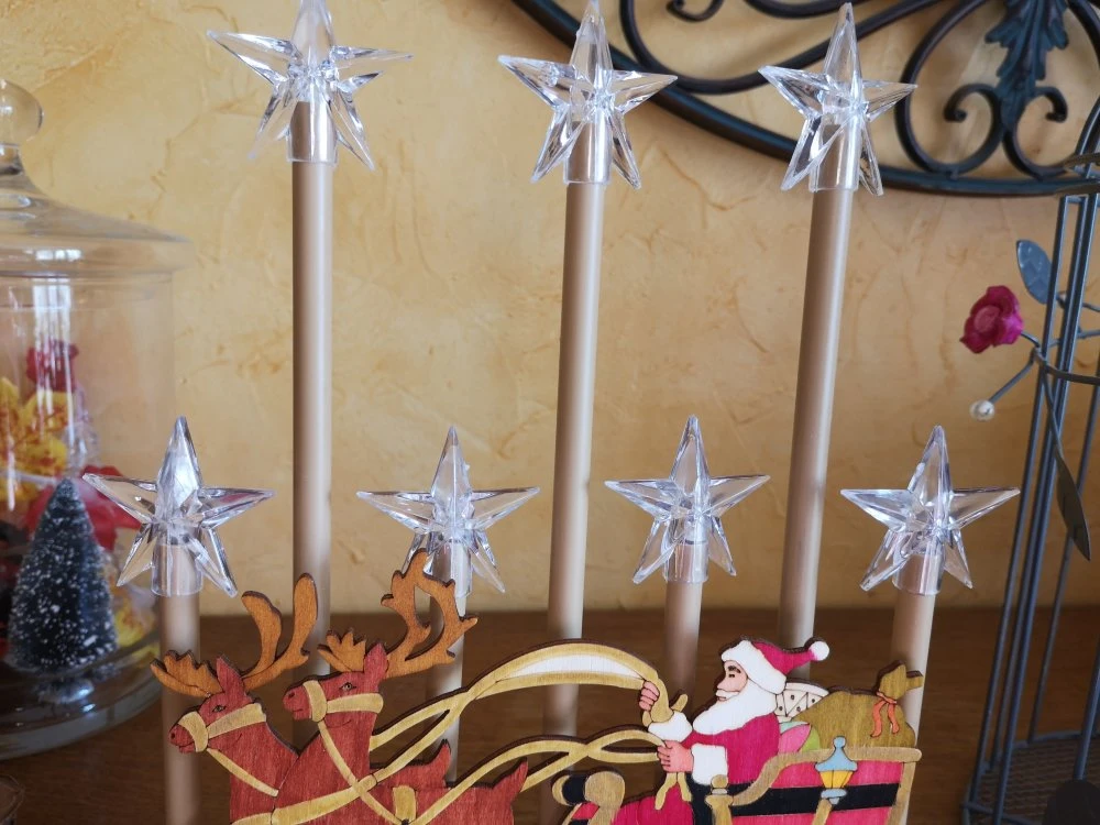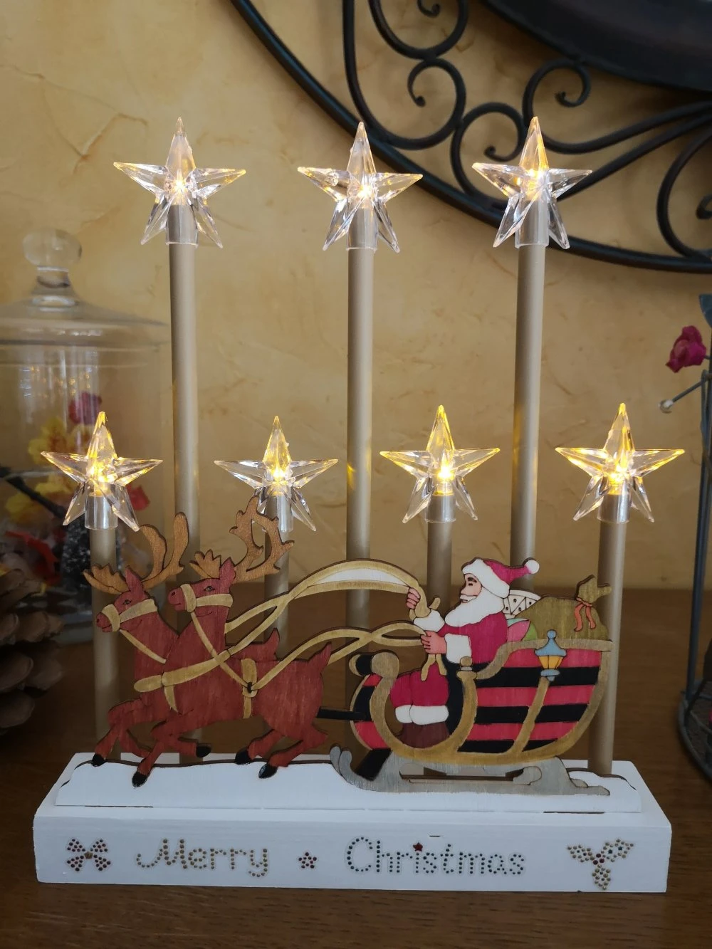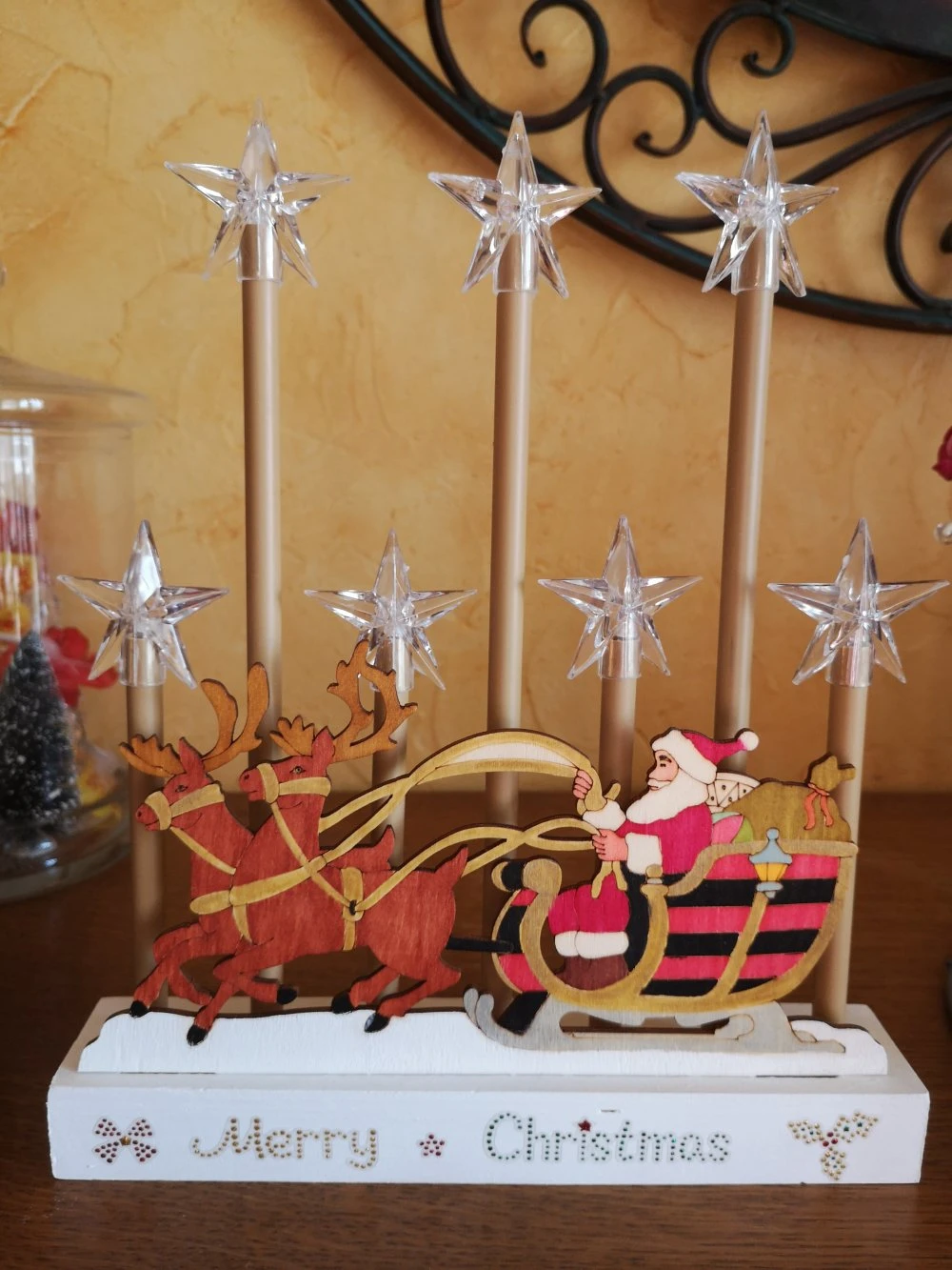 Magnifique chandelier en bois brut, à l’origine, et peint et décoré sur le thème de Noël.