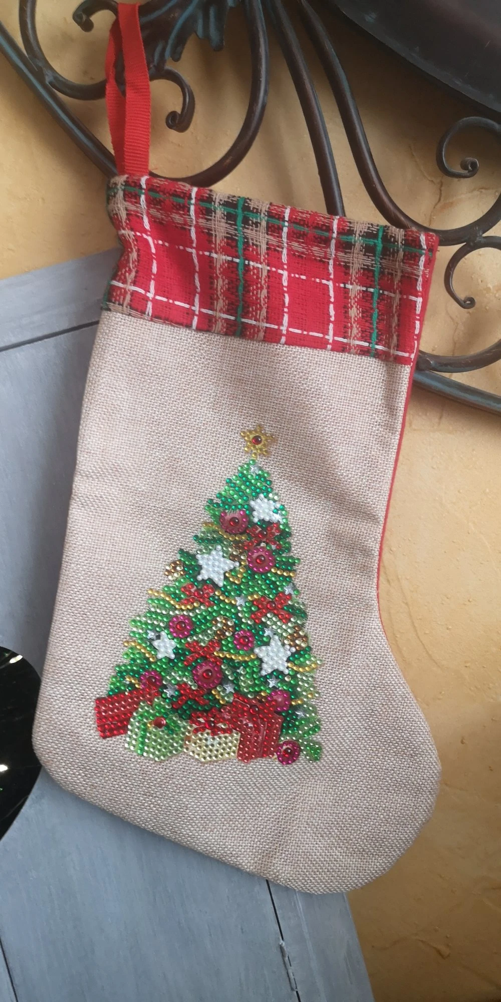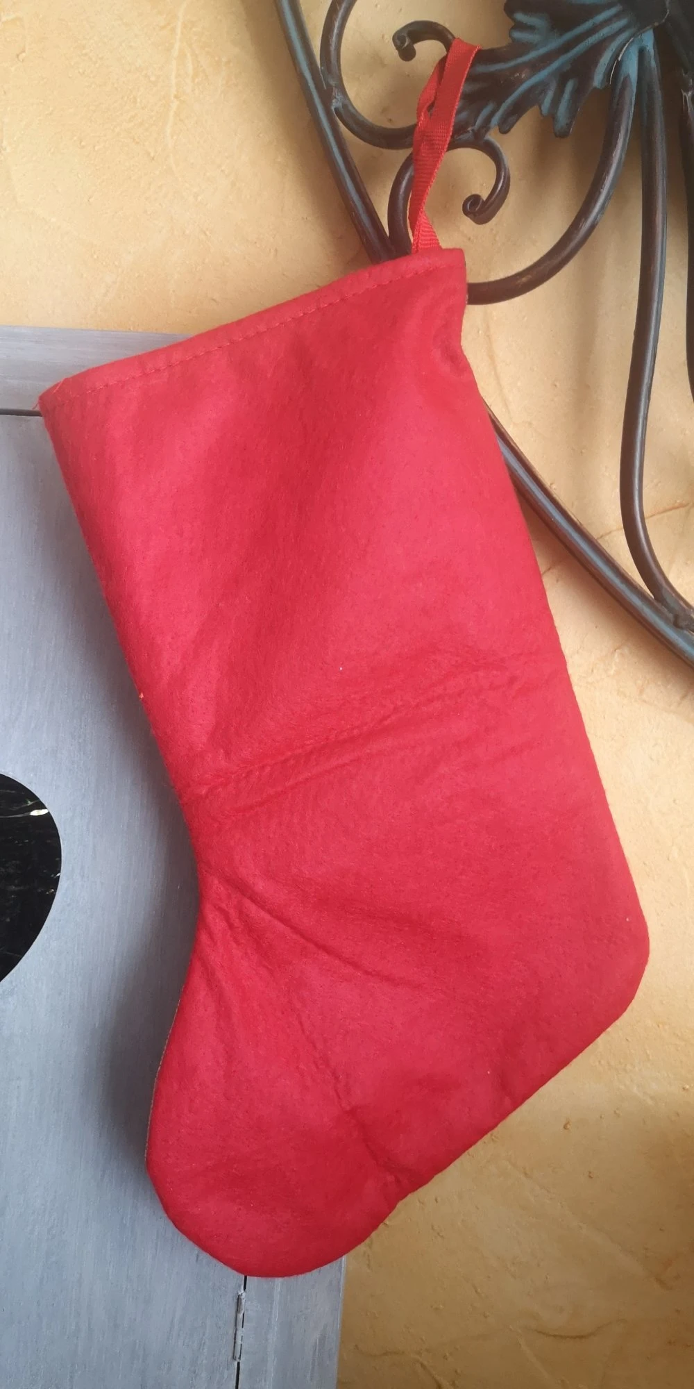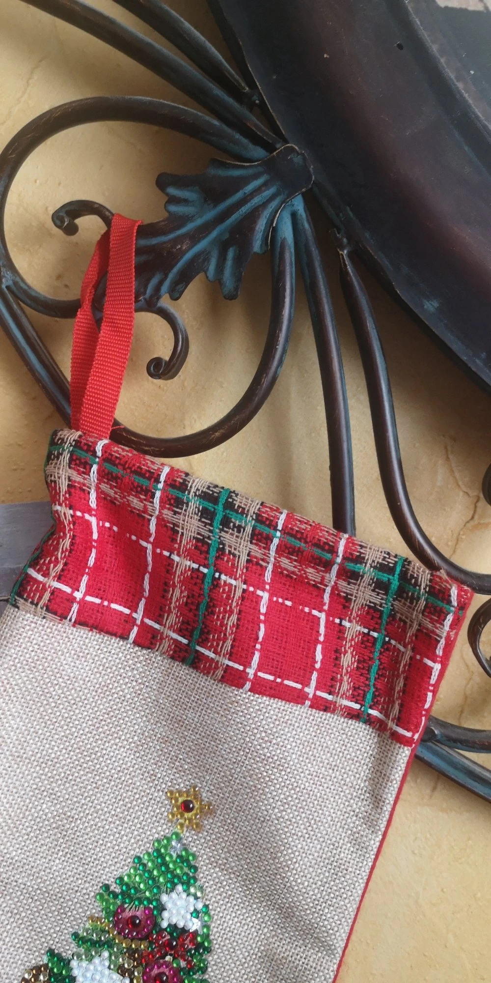 Très jolie chaussette ou botte de Noël réalisée dans de la feutrine et de la fine toile de jute. Un tissu molletonné à carreaux orne le haut de la chaussette.