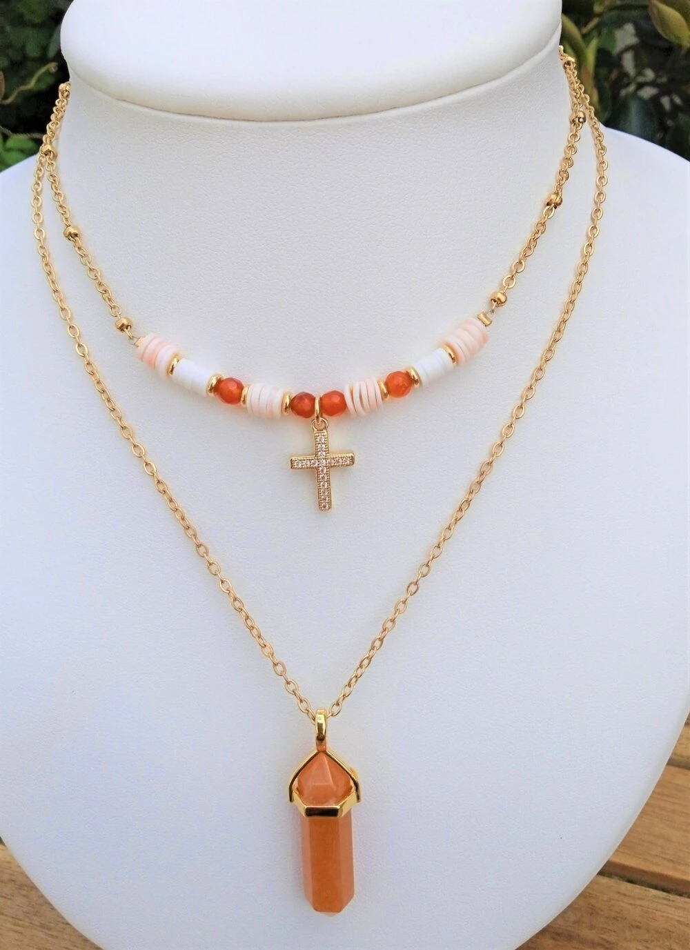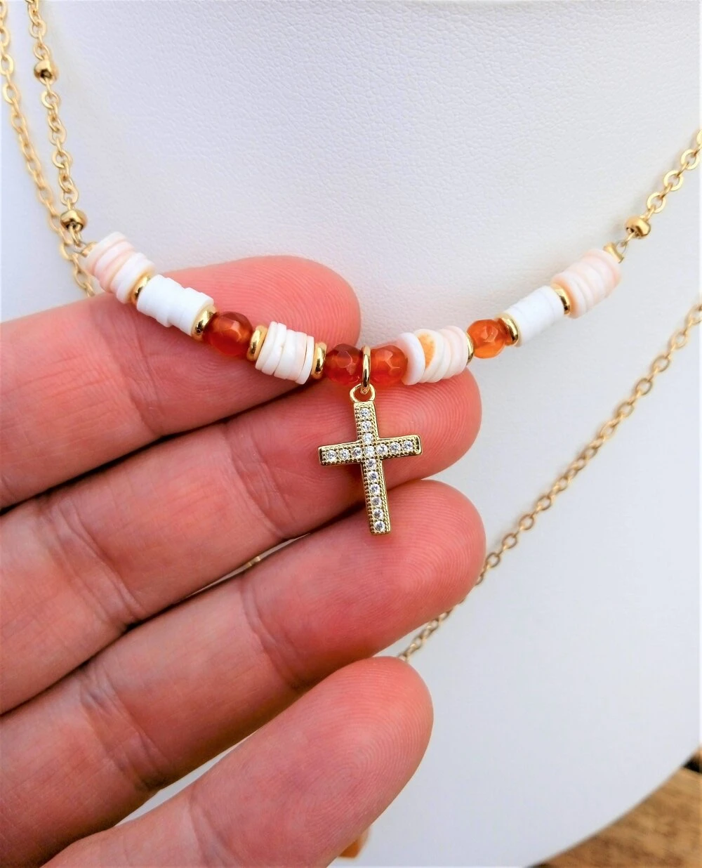 – Premier collier : en acier inoxydable plaqué or, jolie maille 2 mm. Centre : perles 4 mm heishi coquillage et polymère, perles séparateur 3.5 mm acier inox or et perles de cornaline véritable 4 mm (longueur 6.5 cm), orné d’une jolie petite croix plaqué or avec zircon, très belle qualité (15,5 x 11 x 2 mm)