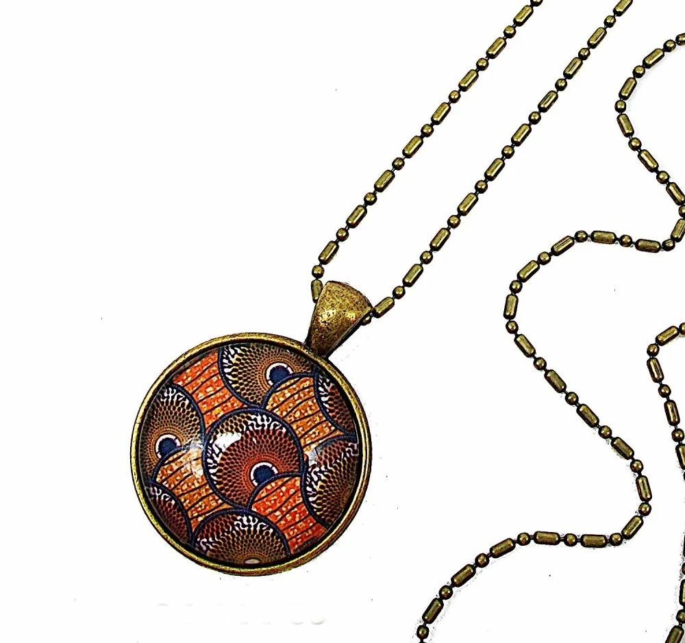 Voici un collier long pendentif rond cabochon en verre . L’image représente un motif Africain wax, dans les tons marrons, bleus, orangés . Un dôme en verre ( cabochon ) recouvre et protège l’image.