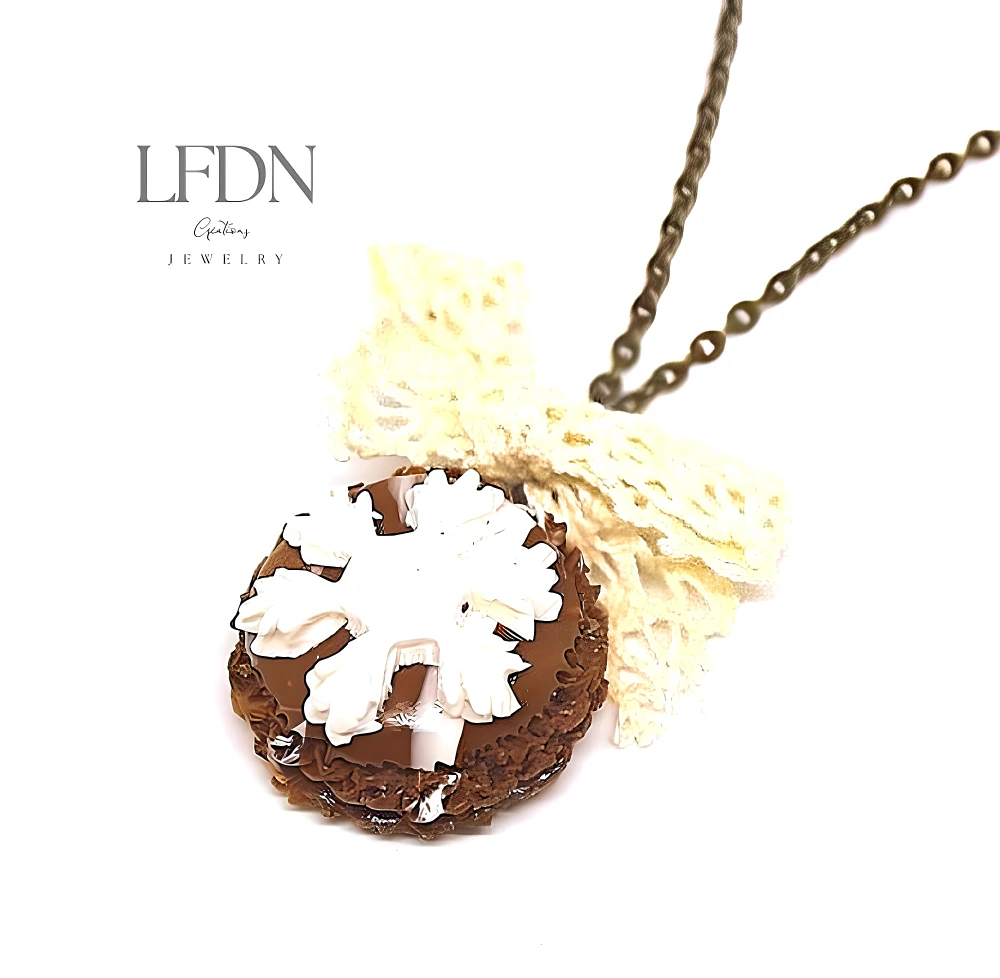 Collier macaron noel en fimo : diamètre 2,5cm , chaîne fine métal couleur bronze hauteur 34 cm, fermoir mousqueton, noeud dentelle écru