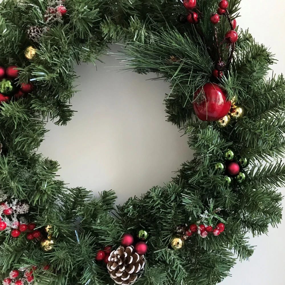 D’un diamètre d’environ 50cm, elle est réalisée sur un support métallique agrémenté de baies et feuillages artificiels, de pommes de pin et de boules de Noël.