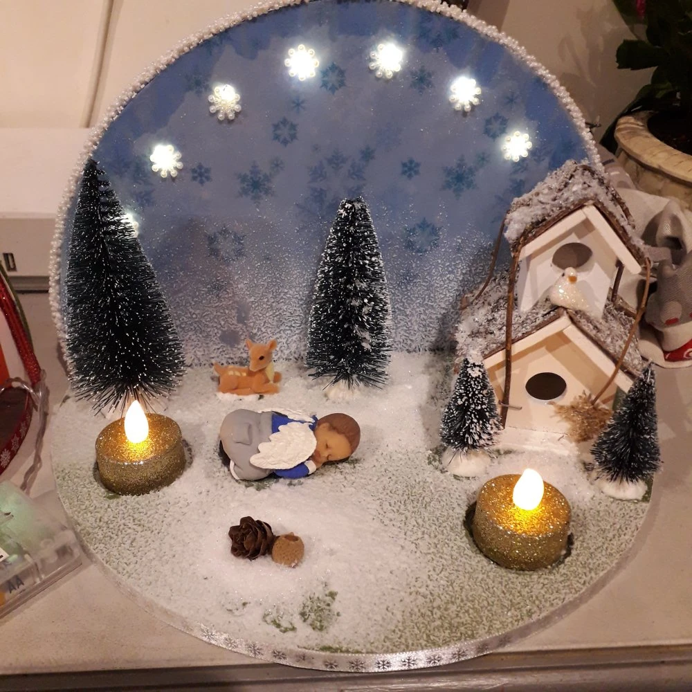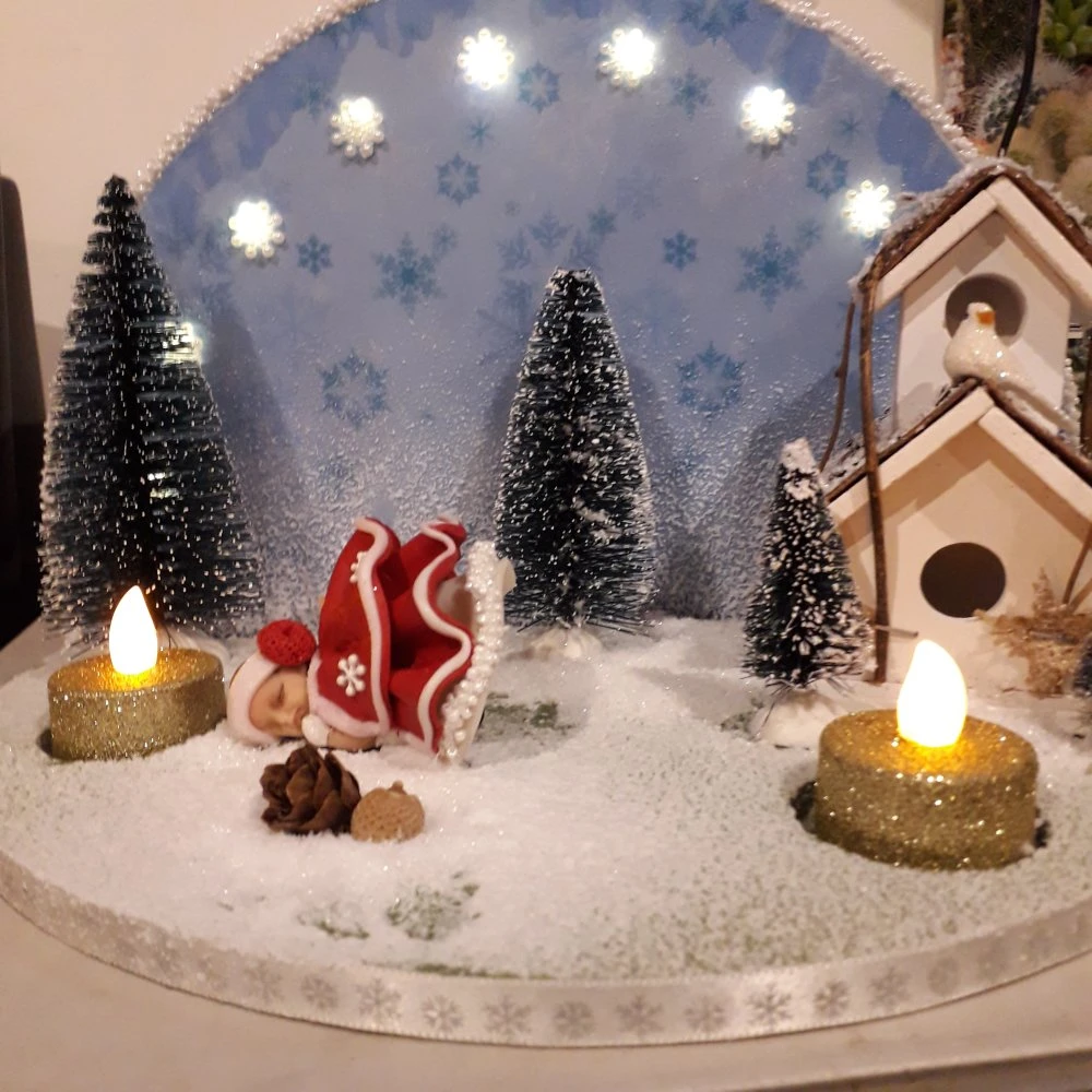 Scène de Noël illuminé par 1 guirlandes LED sur un support en bois.