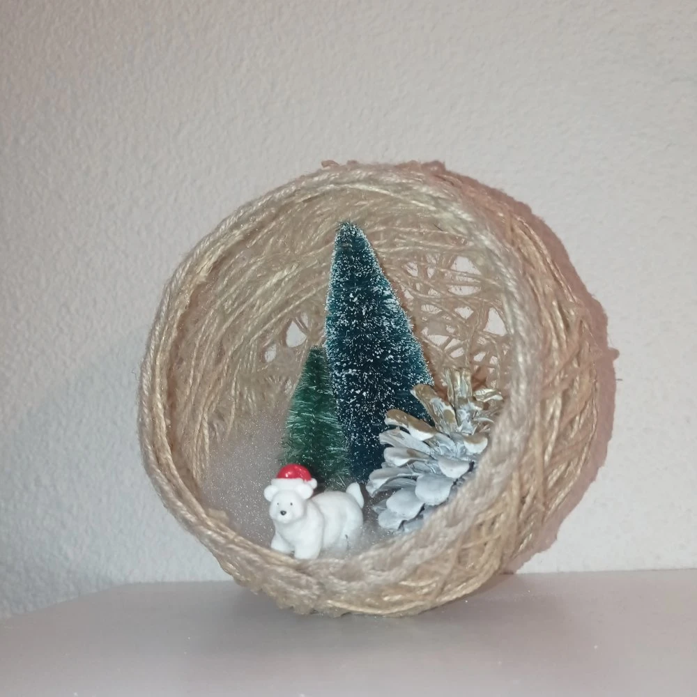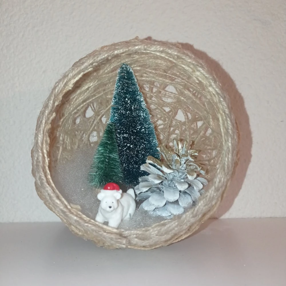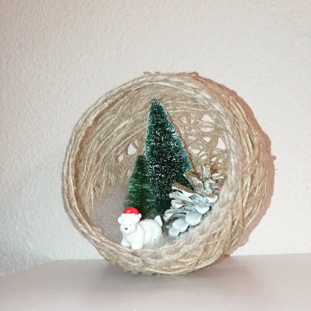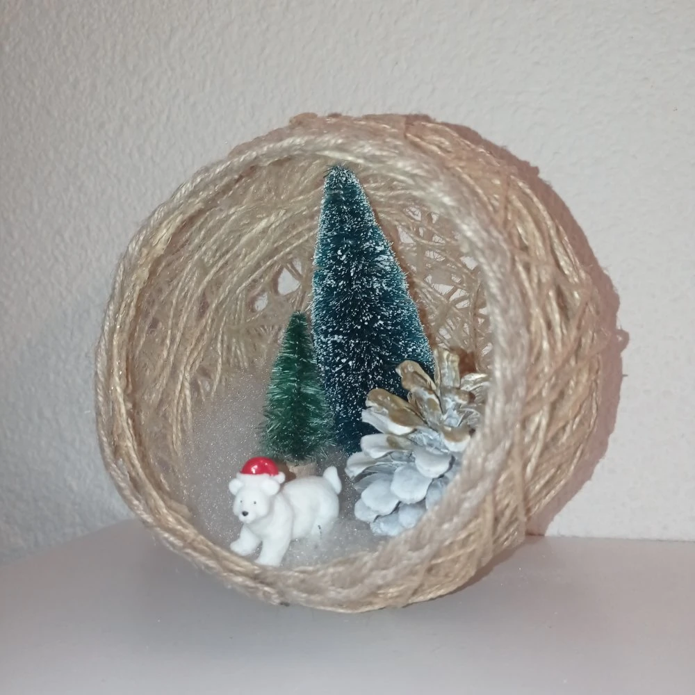 Décor de noël dans boule de corde de jute avec sapin, ours polaire et pomme de pin. Décor unique, boule faite main. Centre de table, décoration de noel.