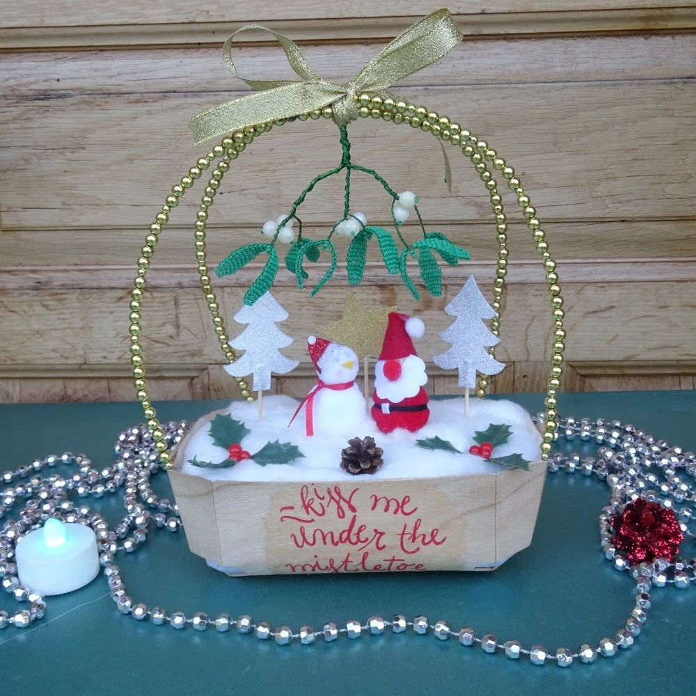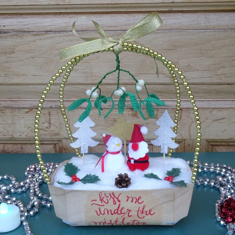 Le tout installé dans une barquette en bois (ancien contenant de pain) décoré à la technique du serviettage du message « Kiss me under the mistletoe » (embrasse moi sous le gui).