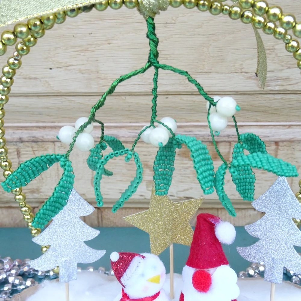 Décoration de Noël, à poser ou à suspendre, composée de 2 arceaux en perles en plastique, dorées, auxquels sont suspendus 3 brins de gui en perles de rocaille décorés d’un nœud en ruban doré. 1 père noël et un bonhomme de neige en pompons se tiennent sous le gui. Ils sont accompagnés de 2 sapins argentés, d’une étoile dorée, de 2 brins de houx et d’une mini pomme de pin.