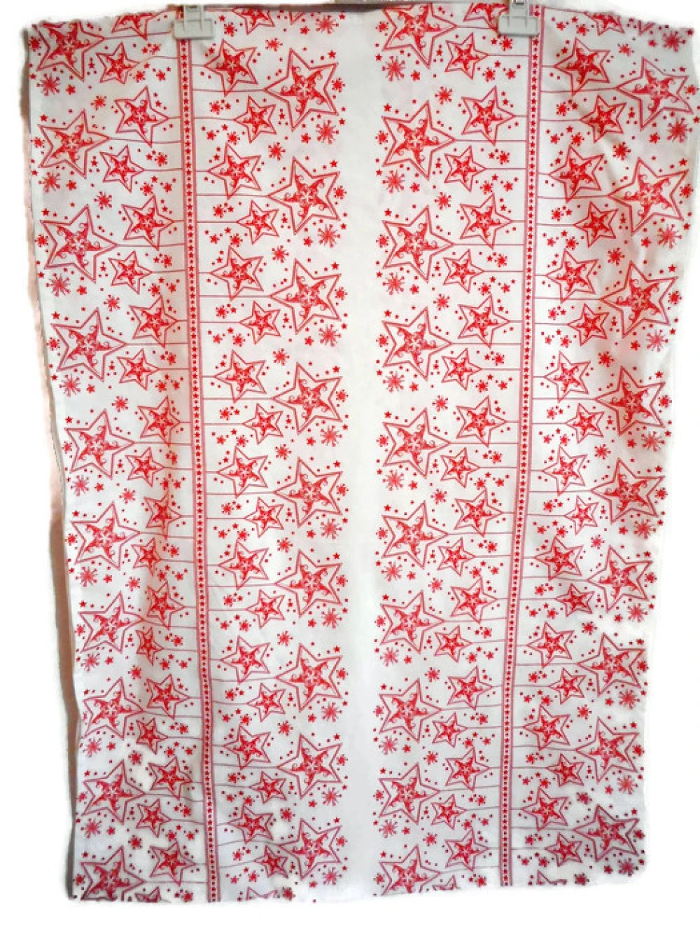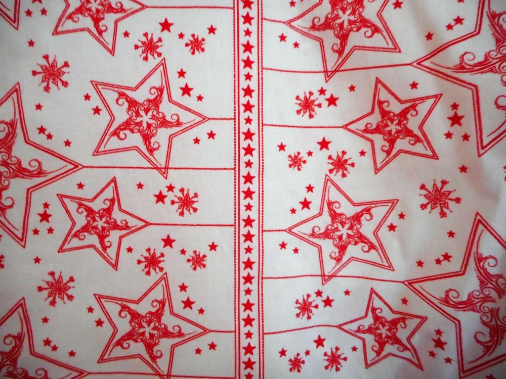 Voici un chemin de table de forme rectangulaire, en coton imprimé d’étoiles rouges sur fond blanc, sur-nappe originale aux couleurs de Noël
