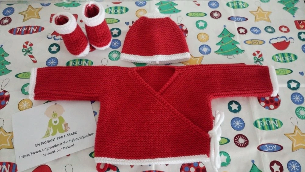 Un ensemble 3 pièces comprenant une petite brassière, une paire de chaussons et un bonnet pour bébé tricoté spécialement pour les fêtes de Noël, la brassière est d’une jolie couleur rouge unie bordée de blanc, elle se ferme par 2 liens à l’intérieur et 2 liens à l’extérieur. Taille 1 mois.