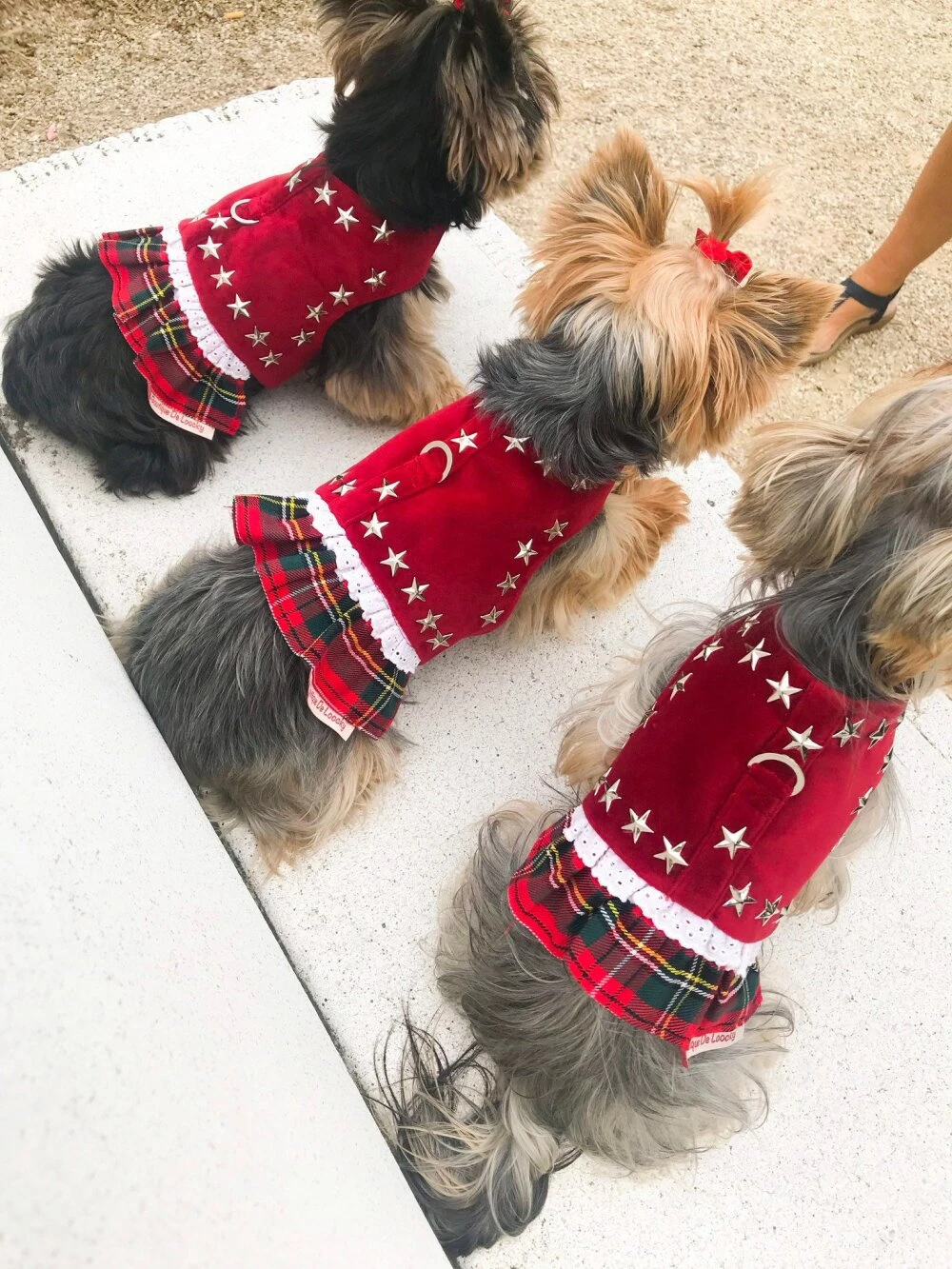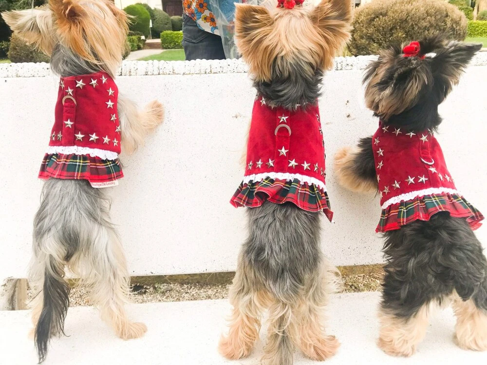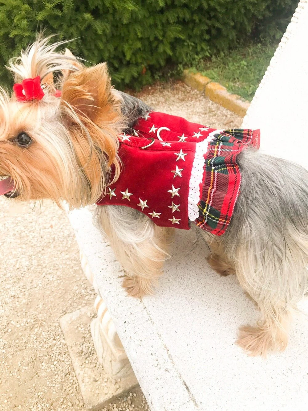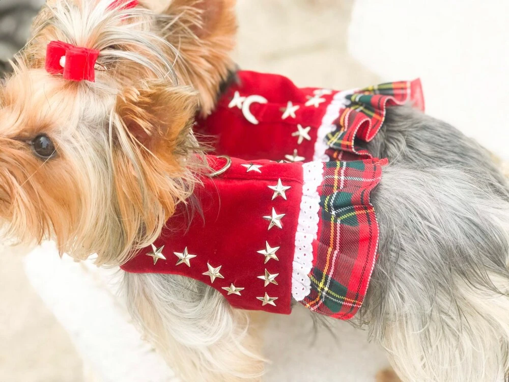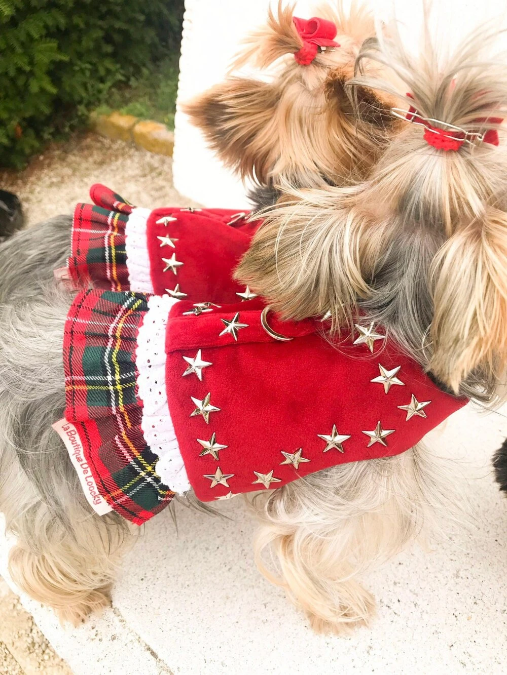 BEAU HARNAIS EN VELOURS ROUGE ( velours de HAUTE Qualité ) AVEC CLOUS FORME ÉTOILE ARGENTÉ ET SONT VOLANT TISSU ÉCOSSAIS + RUBAN DENTELLE