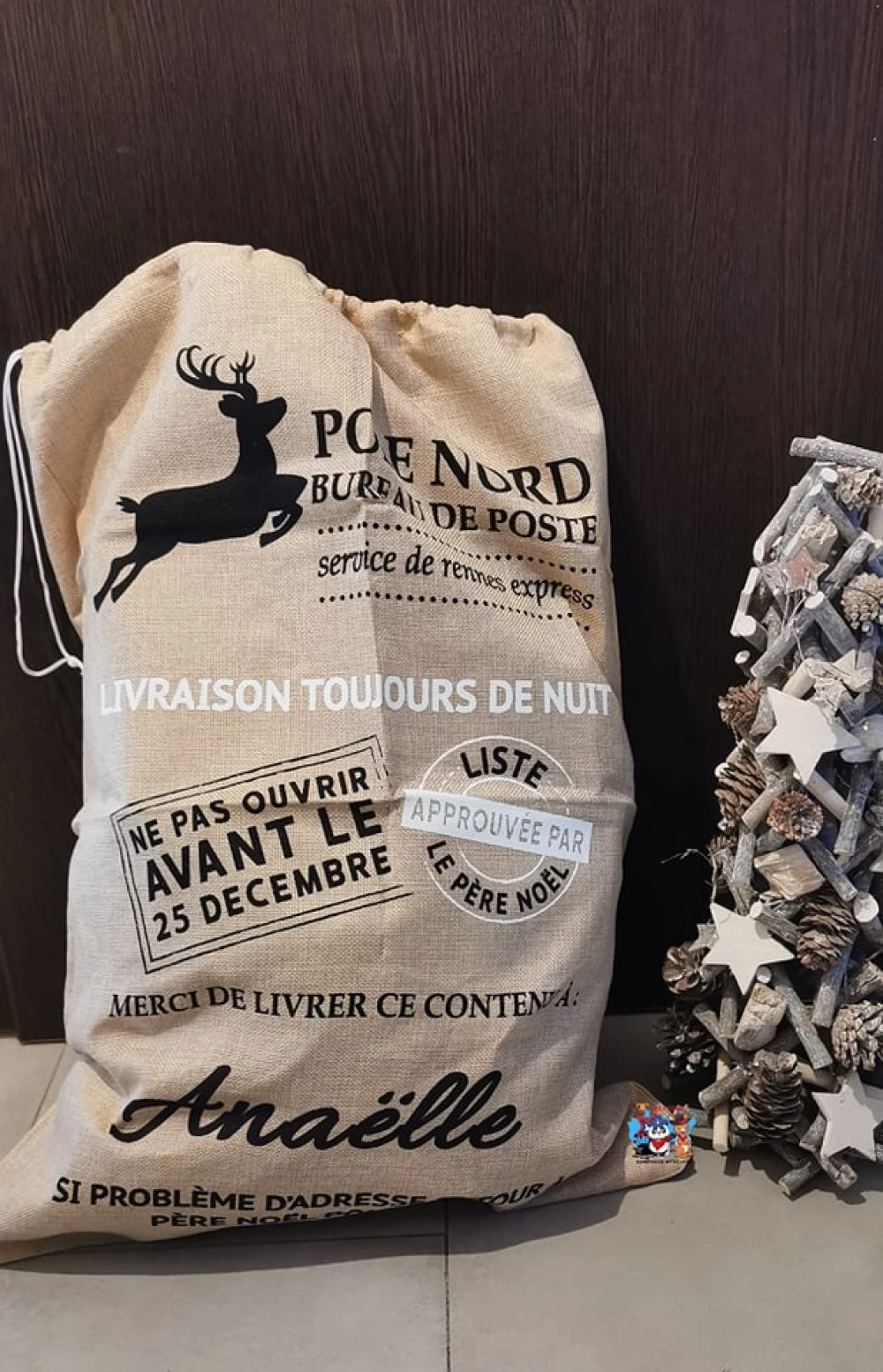 Hotte personnalisée, effet toile de jute, avec le prénom du petit destinataire des cadeaux. Env. 70x49cm