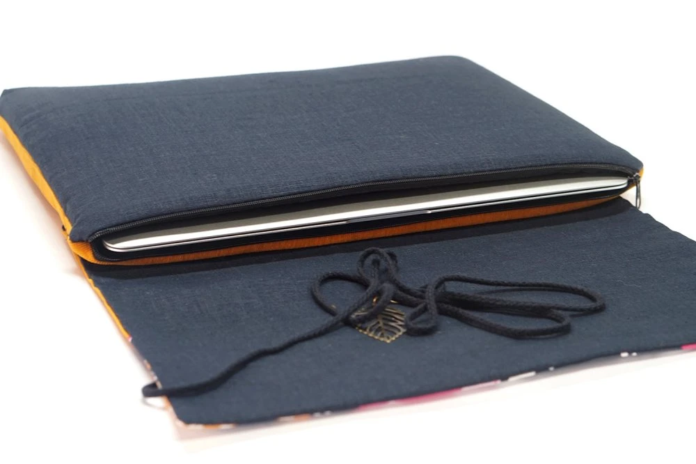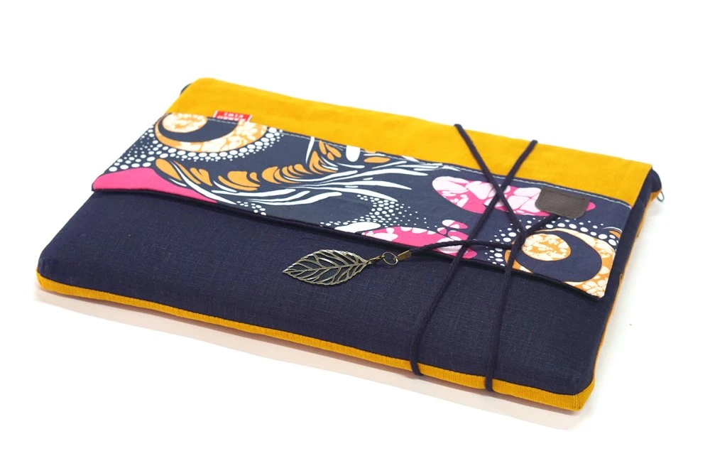 Housse ordinateur portable originale en velours/lin avec rabat et fermeture lanière, fait main et SUR MESURE
