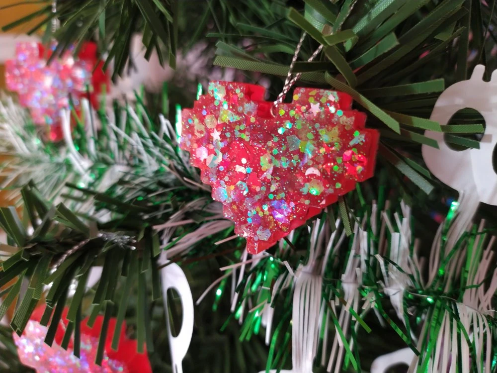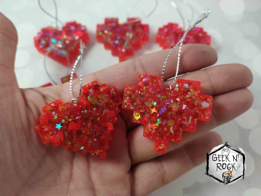 Voici un joli lot de six coeurs pixélisés réalisés à la main, ils sont en résine et paillettes holographiques. dans les tons rouges.