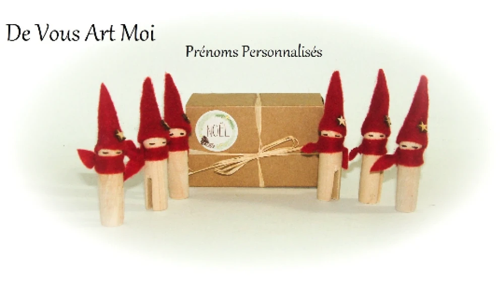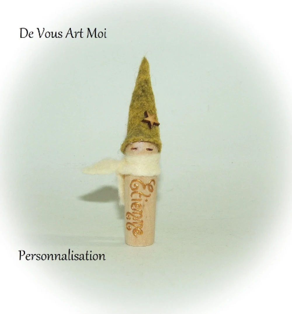 ensemble de lutin en bois et laine avec encoche pour le glisser sur le verre ou le rebord de l’assiette, ou le poser sur votre table