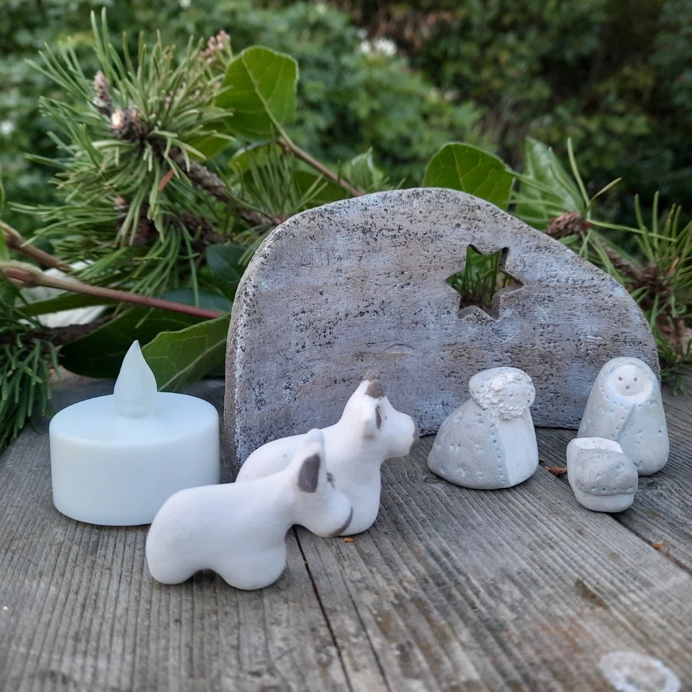 Une toute petite crèche composée de la Nativité, Jésus Marie Joseph, le bœuf, l’âne et un mouton modelés en terre blanche, léger voile bleu clair et quelques empreintes sur les vêtements.