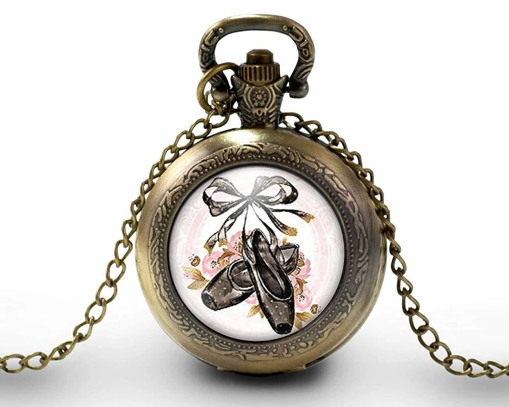 → Collier (sautoir) pourvu d’une montre gousset, illustrée et couverte d’un cabochon de verre.