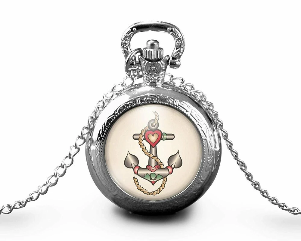 → Collier (sautoir) pourvu d’une montre gousset, illustrée et couverte d’un cabochon de verre.