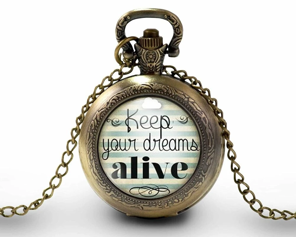 → Collier (sautoir) pourvu d’une montre gousset, illustrée et couverte d’un cabochon de verre.