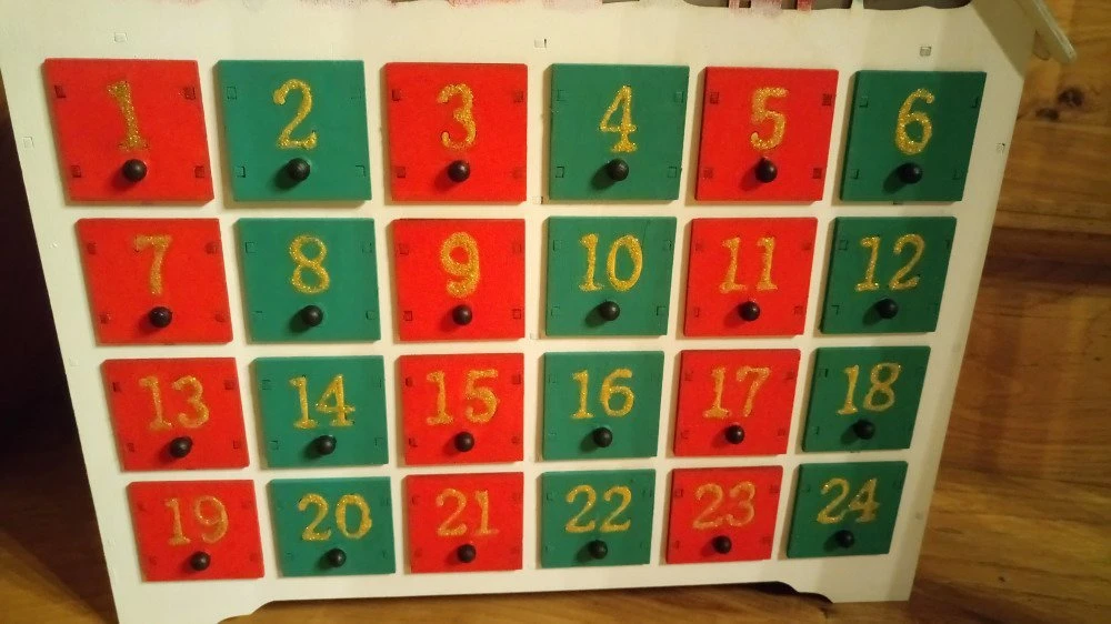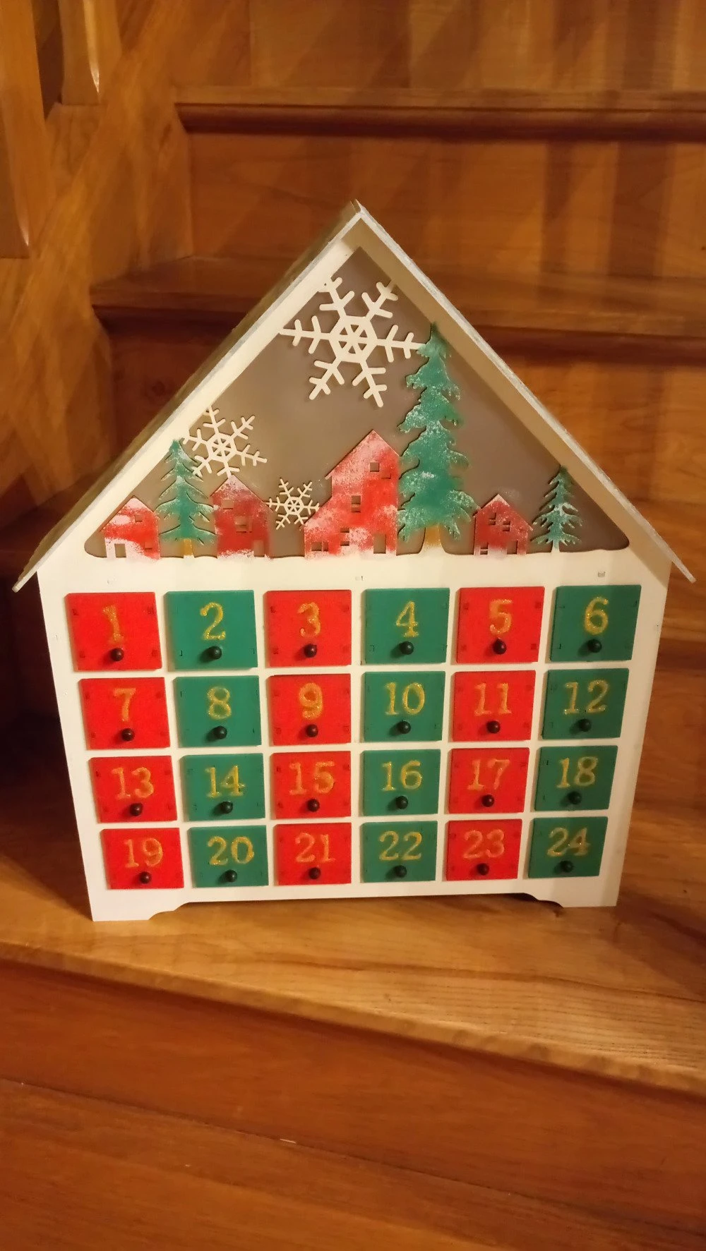 Je l’ai tout d’abord peins en rouge,vert,et blanc.Les chiffres ont été dessinés avec des paillettes dorées et les petites poignées des 24 tiroirs ont été peintes en noir.Le toit a,quand à lui,été mis en couleur grise et blanc en imitation de neige.
