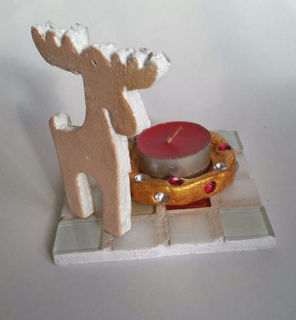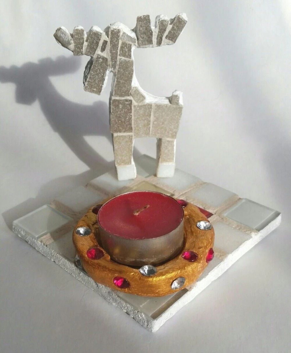 Ce petit Renne et son support carré est un assemblage en bois mdf que j’ai recouvert de mosaïque en pâte de verre marron taupe, crème, blanc, rouge puis collé. Le porte photophore a été réalisé en pâte de modelage autodurcissante, avec des incrustations de petits diamants fantaisie couleur blanc-argent et rose-rouge puis peint en couleur or à l’acrylique. Il est amovible donc vous pourrez le déplacer où bon vous semble, et remplacer la bougie photophore sans difficulté. Le dos du petit Renne est peint à l’acrylique couleur marron clair crème. Livré avec la bougie photophore. Conseils de sécurité : ne pas laisser sans surveillance d’un adulte, tenir éloigné d’un courant d’air, des animaux et des enfants, humecter entre deux doigts pour éteindre.