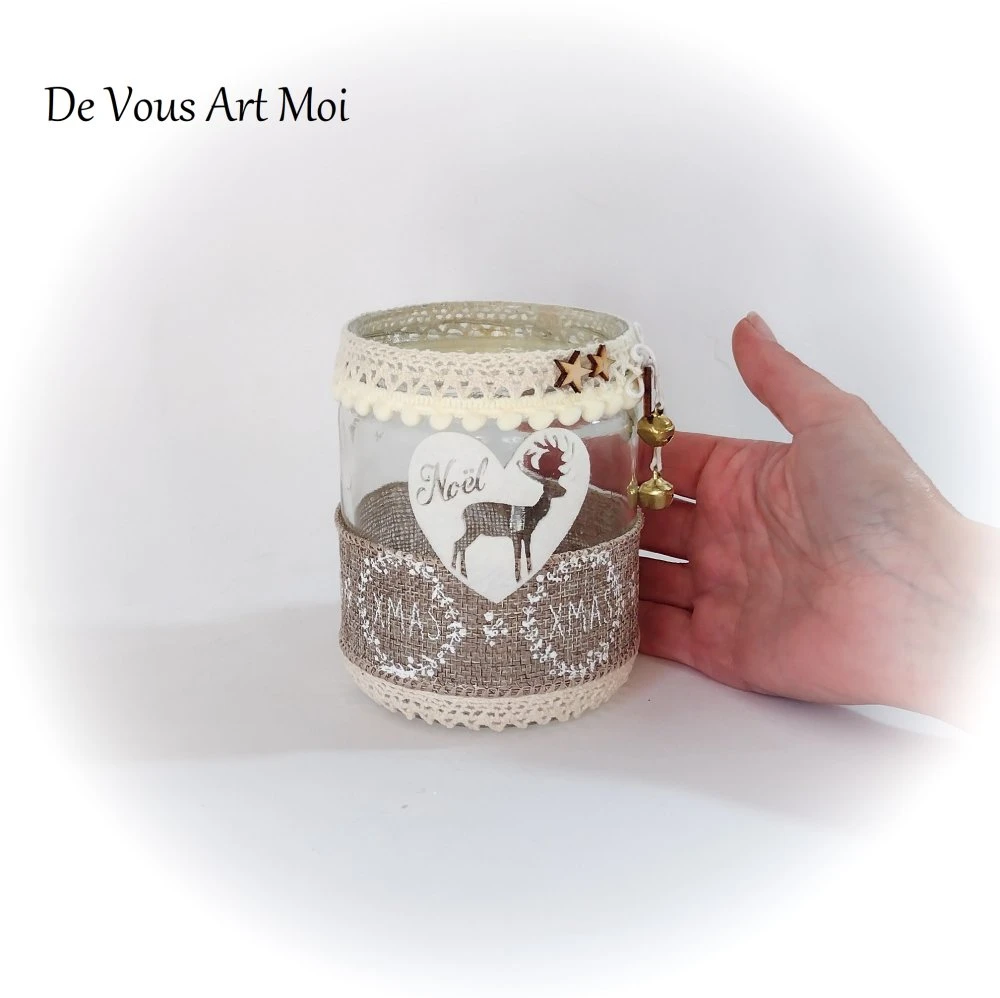 photophore rustique traditionnel en verre décoré à la main avec de la dentelle,du bois,tissus en jute,grelots,feutrine…