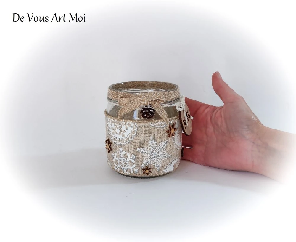photophore rustique traditionnel en verre décoré à la main avec du lin,tissus en jute,bois,pomme de pin naturelle,ficelle