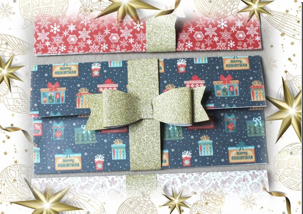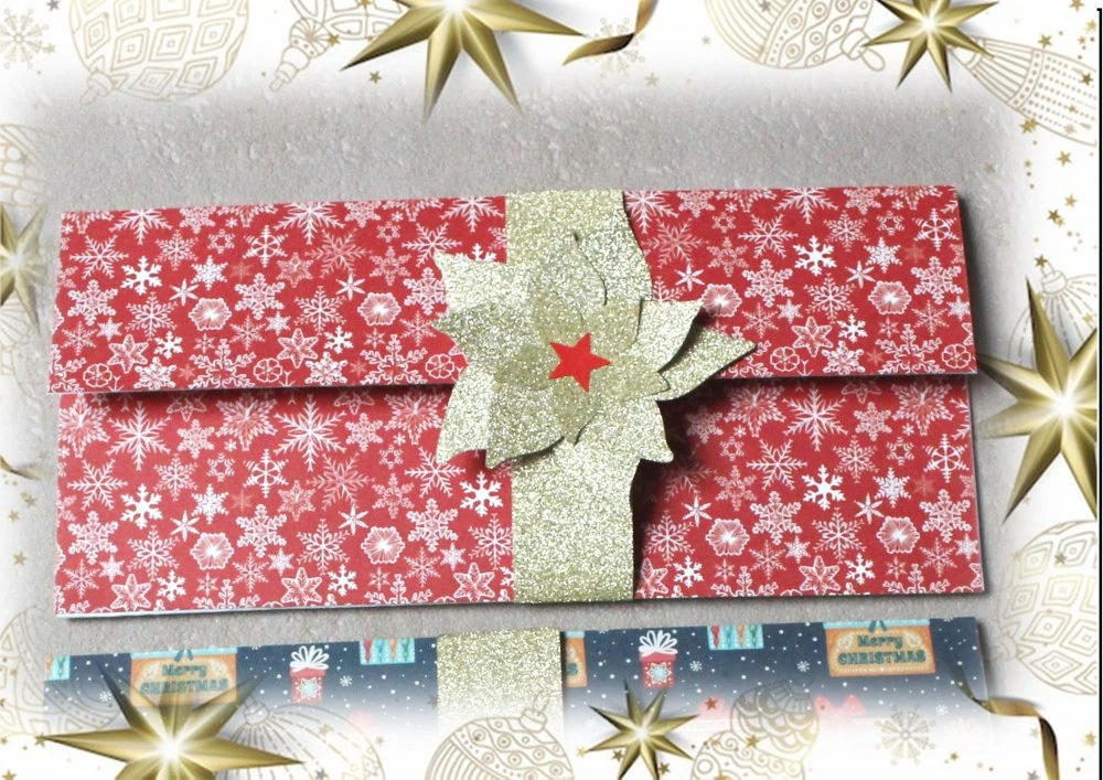 Idéales pour y glisser un chèque, quelques billets ou un message, elles sont réalisées par mes soins à partir de beau papier cartonné et agrémentées d’un beau noeud ou d’une fleur de poinsettia en paillettes dorées et d’une petite carte pour y écrire le prénom de l’heureux destinataire