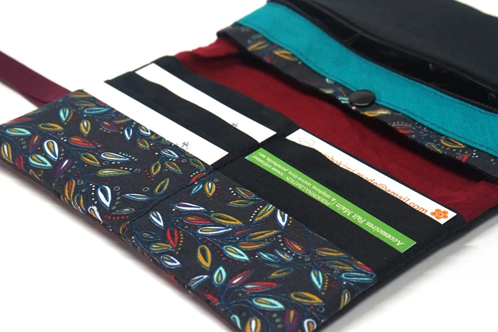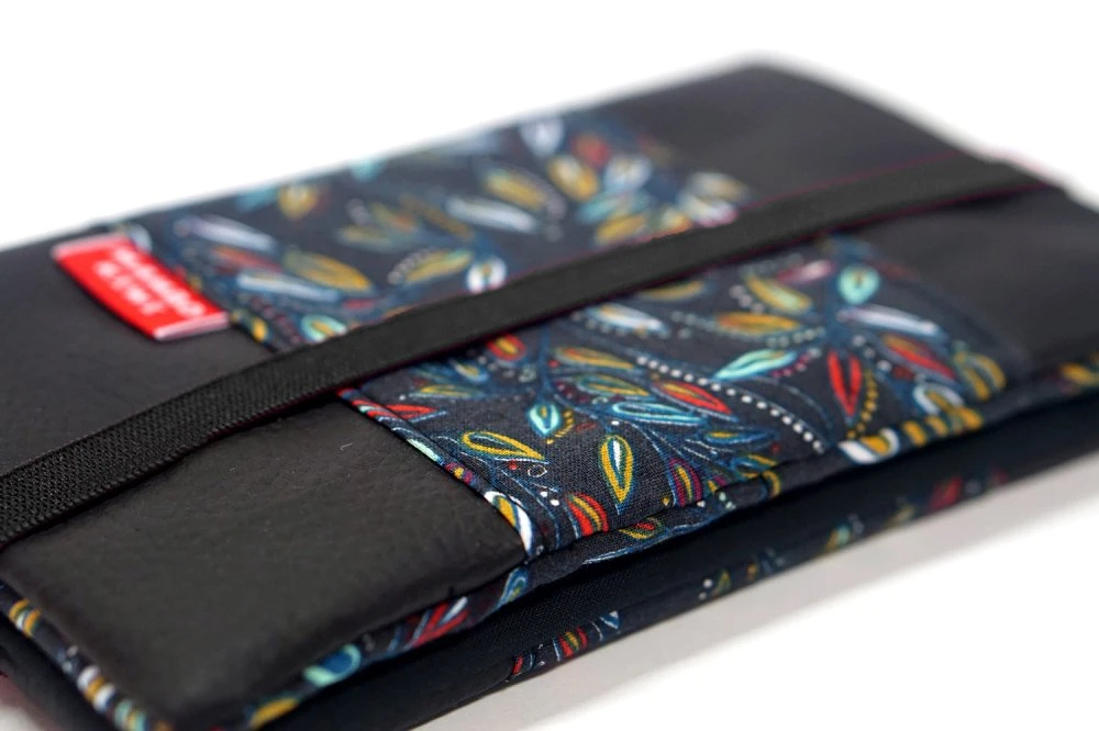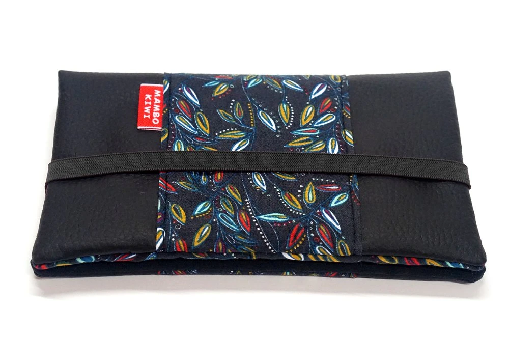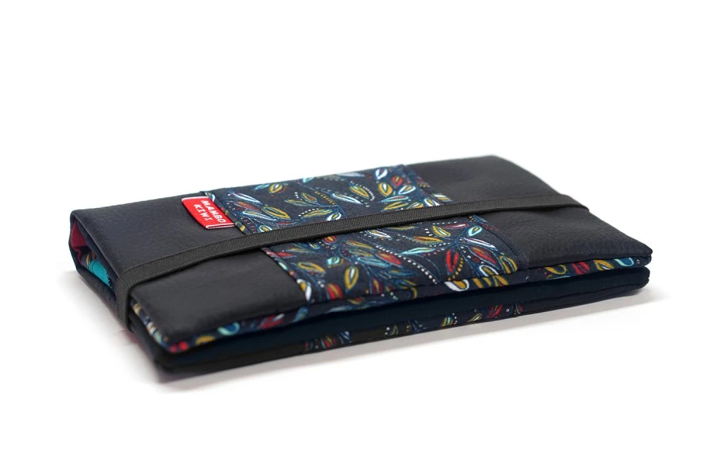 Personnalisation GRATUITE des tissus : créez vous même votre portefeuille en choisissant votre couleur de simili cuir, votre tissu à motif et votre couleur d’élastique.