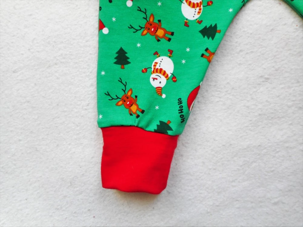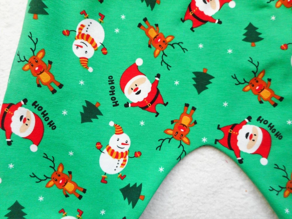 Pantalon en jersey de coton, imprimé de bonhommes de neige, de pères Noël criant « hohoho » !!! , de rennes, de sapins et de flocons de neige, sur fond vert.