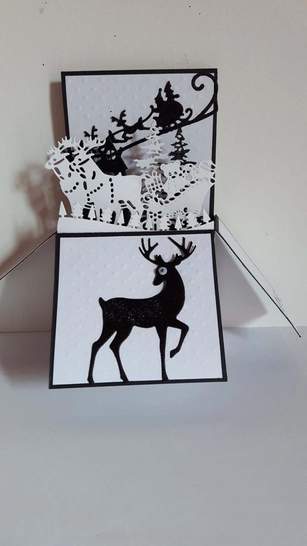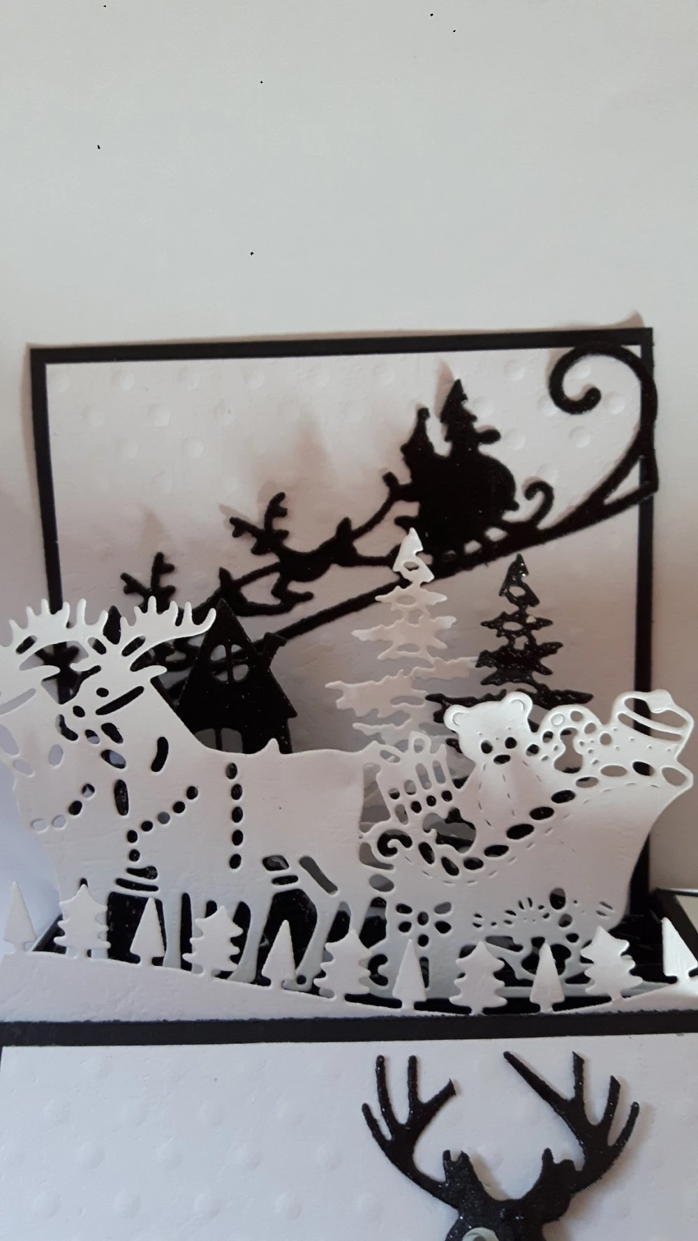 Une carte tout à fait ordinaire fermée, qui, une fois ouverte, est posée comme une boîte et dévoile une multitude de petits éléments en 3 D et en hauteur : un superbe cadeau de Noël