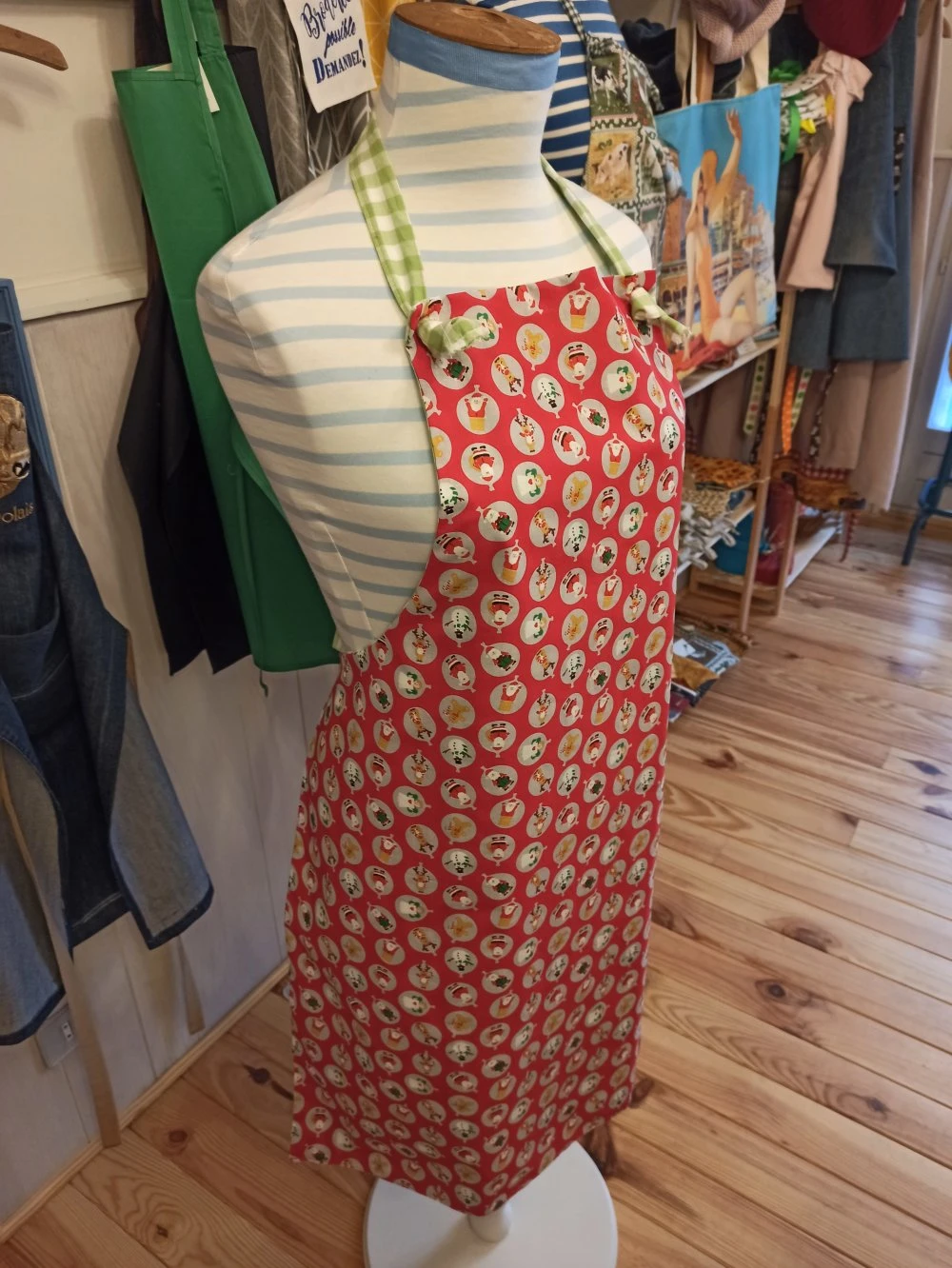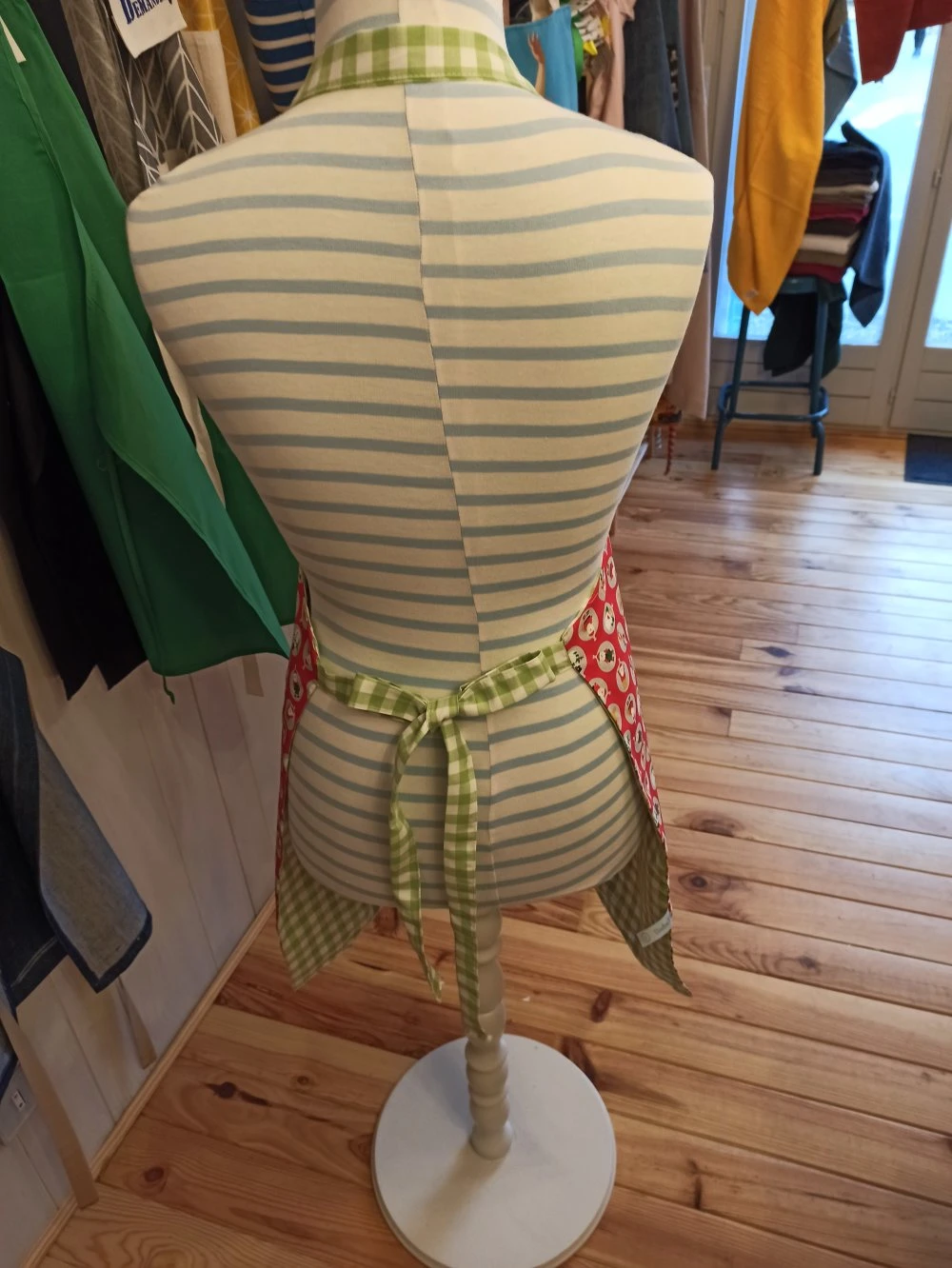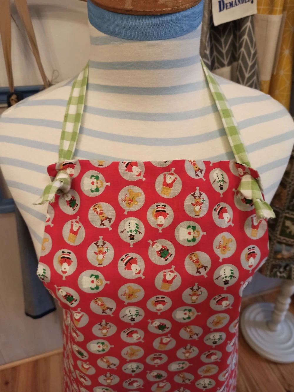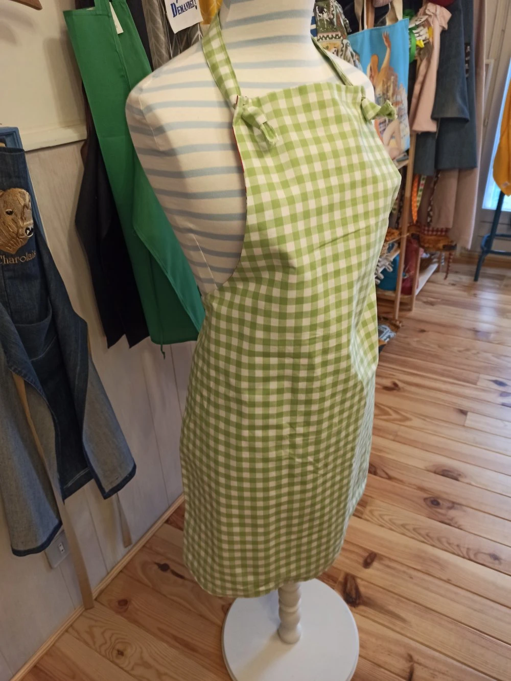 Tablier en coton, un côté carreaux Vichy vert tilleul et blanc, un côté rouge avec un imprimé Noël.
