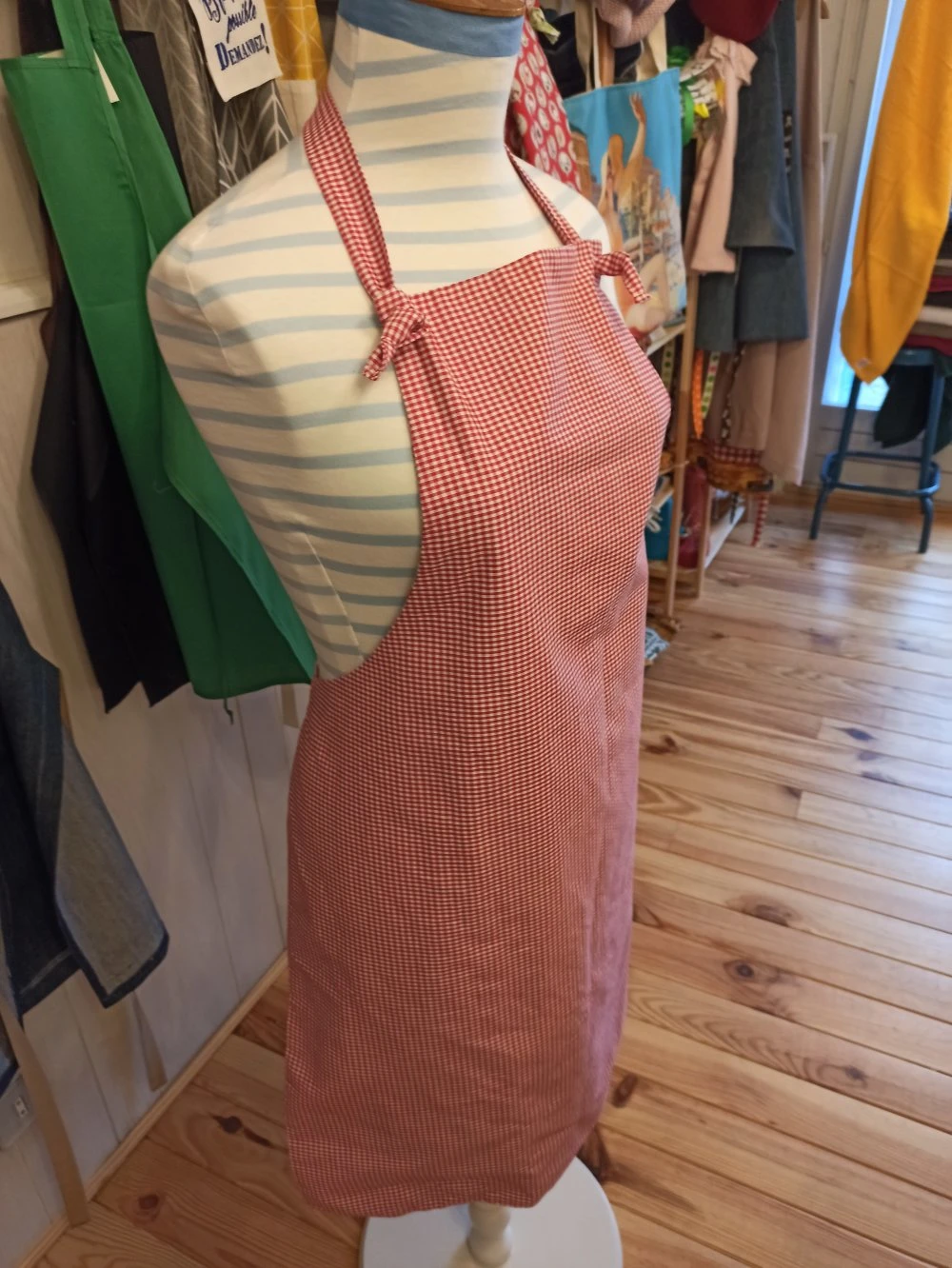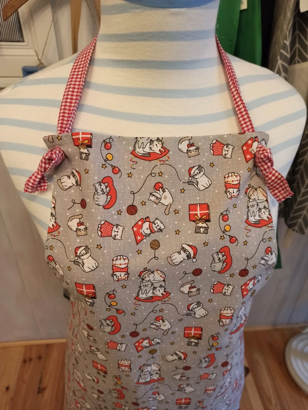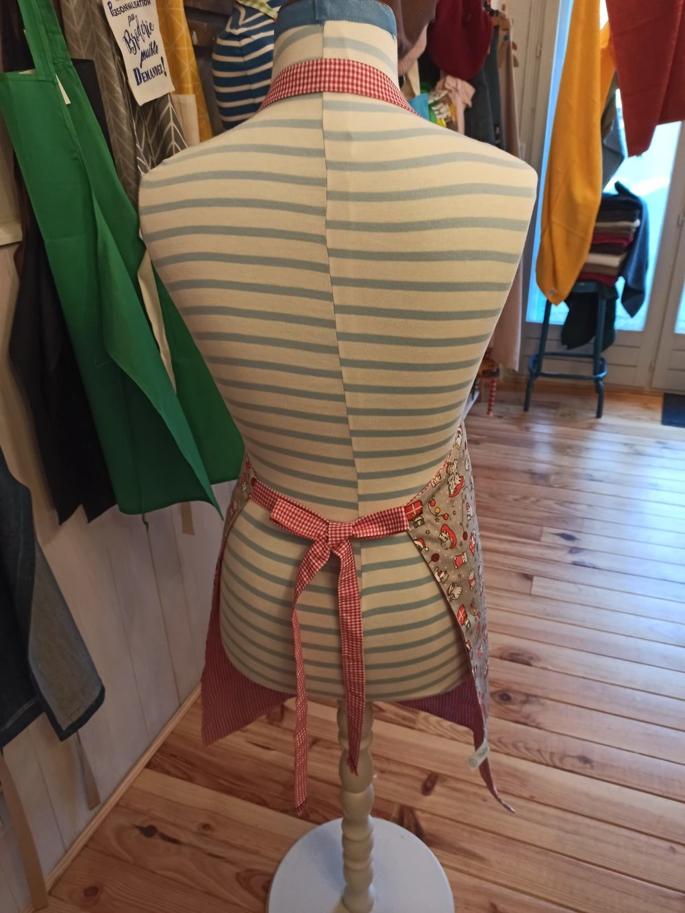 Tablier en coton, un côté rayures rouge et blanc, un côté noir avec un imprimé Noël rouge, blanc et doré.