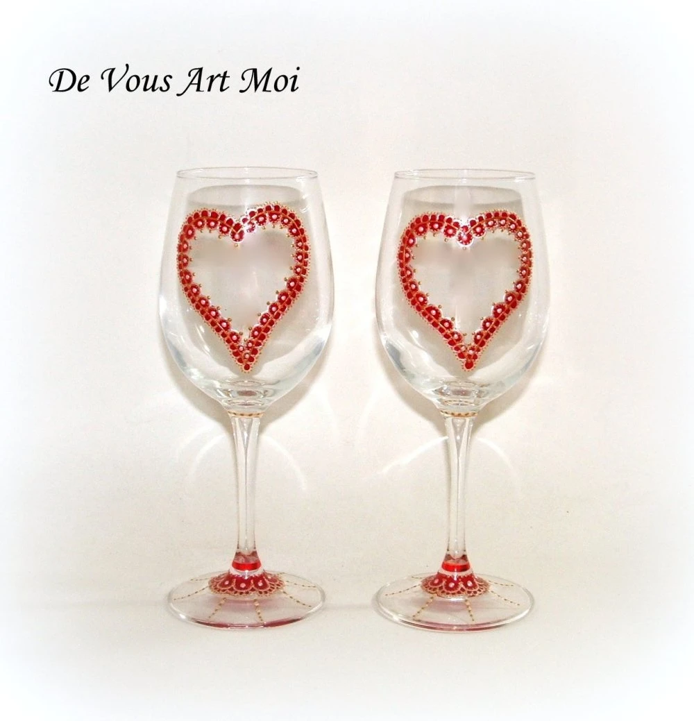 Verre à vin cœur,duo de grands verres à vin,peint à la main,or rouge,peinture sur verre,verre artisanal Noël,fait main,cadeau couple,verre de Noël,vaisselle de Noël