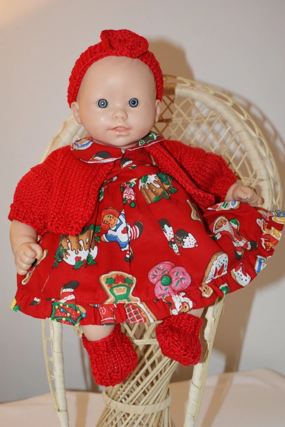 tenue thème Noel pour poupon de 30 cm , composée de 5 pièces : une petite robe rouge imprimée gâteaux de Noel avec volant dans le bas et fermée par boutons pressions dans le dos , une petite culotte bouffante rouge élastiquée , un petit gilet , un bandeau et une paire de petits chaussons en coton rouge.